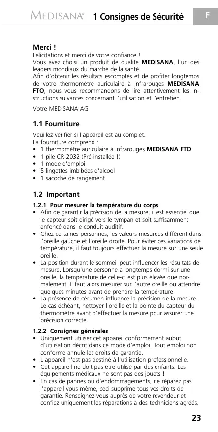 Afin d'obtenir les résultats escomptés et de profiter longtemps de votre thermomètre auriculaire à infrarouges MEDISANA FTO, nous vous recommendons de dire attentivement les instructions suivantes concernant l'utilisation et l'entretien.
