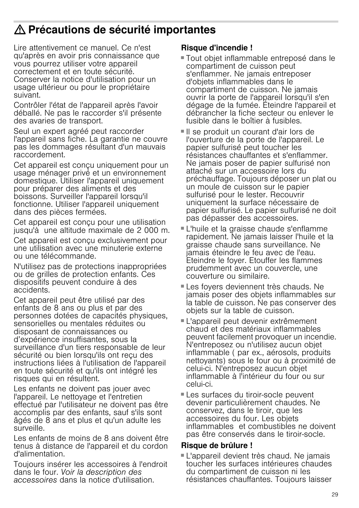 L'appareil peut devenir extrémement chaud et des matériaux inflammables peuvent facilement provoquer un incendie. N'entreposez ou n'utilisez aucun objet inflammable (par ex., aérosols, produits nettoyants) sous le four ou à proximité de celui-ci. N'entreposez aucun objet inflammable à l'intérieur du four ou sur celui-ci. - Les surfaces du tiroir-socle peuvent devenir particulièrement chaudes. Ne conservez, dans le tiroir, que les accessoires du four. Les objets inflammables et combustibles ne doivent pas'être conservés dans le tiroir-socle.