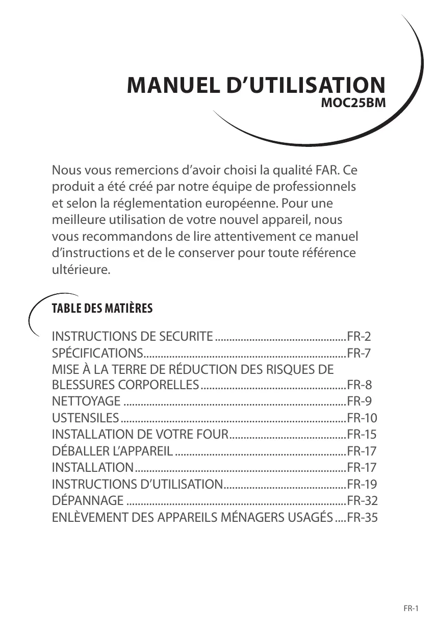 MOC25BM Nous vous remercions d’avoir choisi la qualité FAR. Ce produit a été créé par notre équipe de professionnels et selon la réglementation européenne. Pour une meilleure utilisation de votre nouvel appareil, nous vous recommandons de lire attentivement ce manuel d’instructions et de le conserver pour toute référence ultérieure.