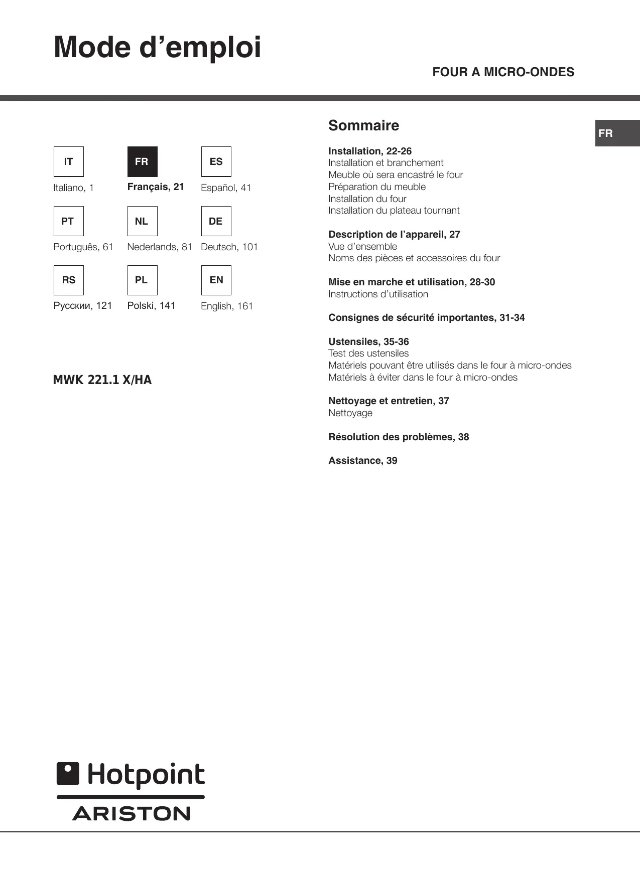 MWK211KHA - Micro-ondes HOTPOINT - Notice d'utilisation et mode d'emploi gratuit