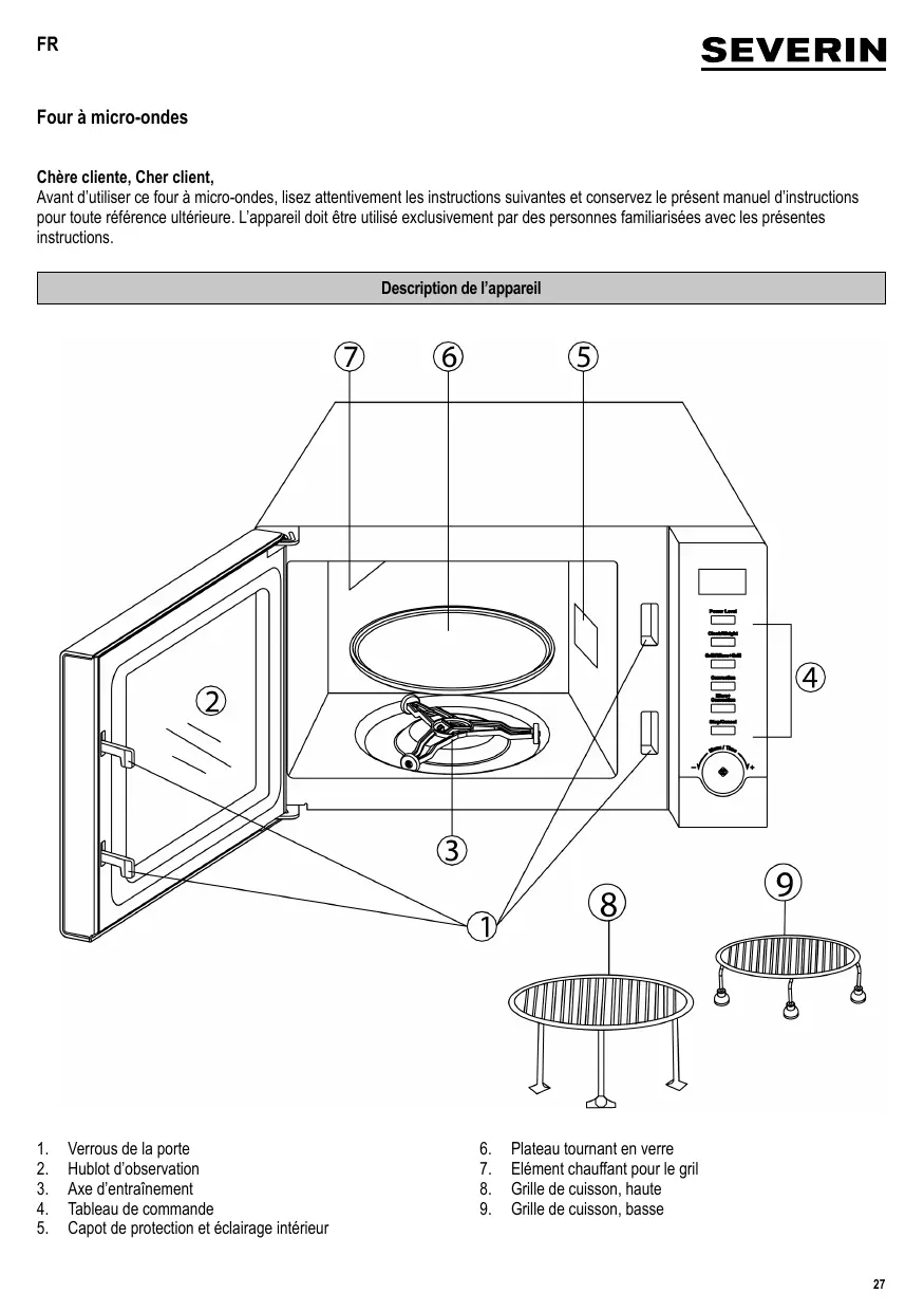 Four à micro-ondes Chère cliente, Cher client, Avant d’utiliser ce four à micro-ondes, lisez attentivement les instructions suivantes et conservez le présent manuel d’instructions pour toute référence ultérieure. L’appareil doit être utilisé exclusivement par des personnes familiarisées avec les présentes instructions. Description de l’appareil