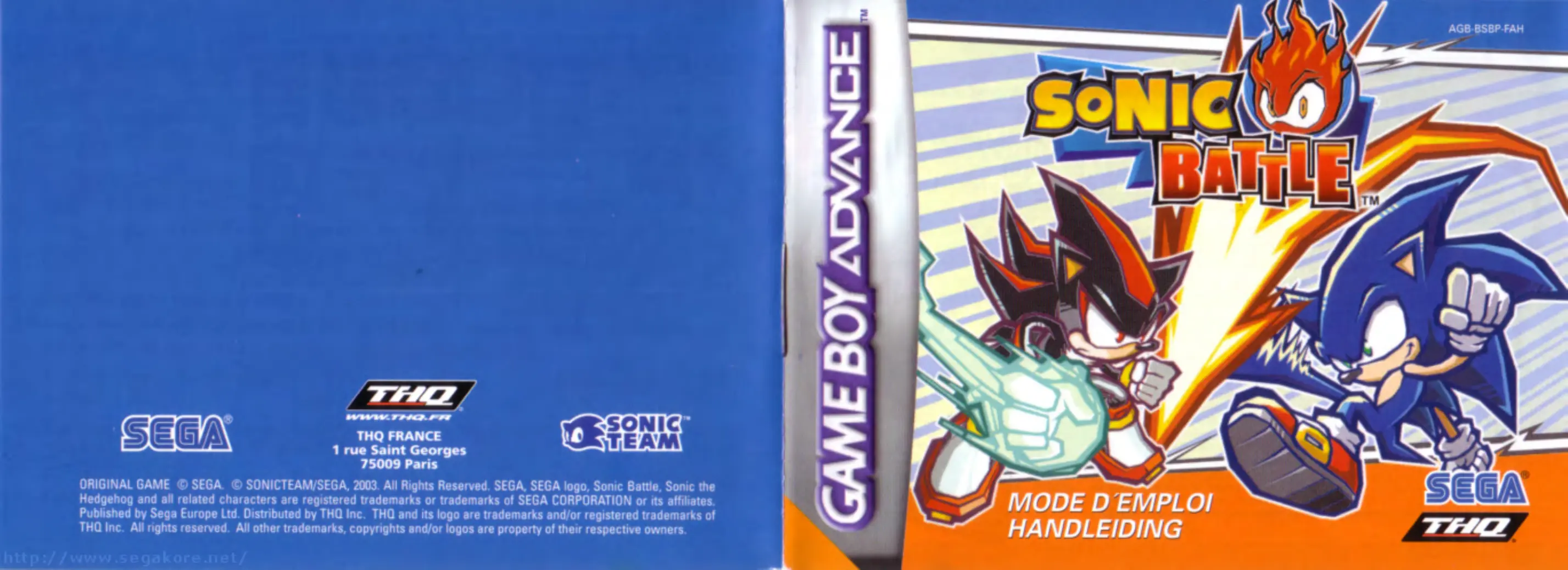 MODE D'EMPLOI SONIC BATTLE GAMES NINTENDO GAME BOY ADVANCE