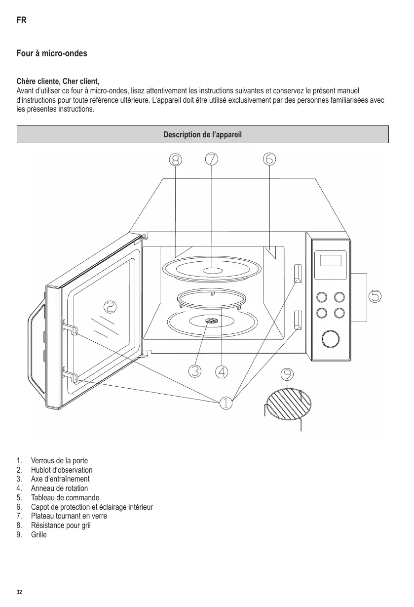 Chère cliente, Cher client, Avant d’utiliser ce four à micro-ondes, lisez attentivement les instructions suivantes et conservez le présent manuel d’instructions pour toute référence ultérieure. L’appareil doit être utilisé exclusivement par des personnes familiarisées avec les présentes instructions. Description de l’appareil