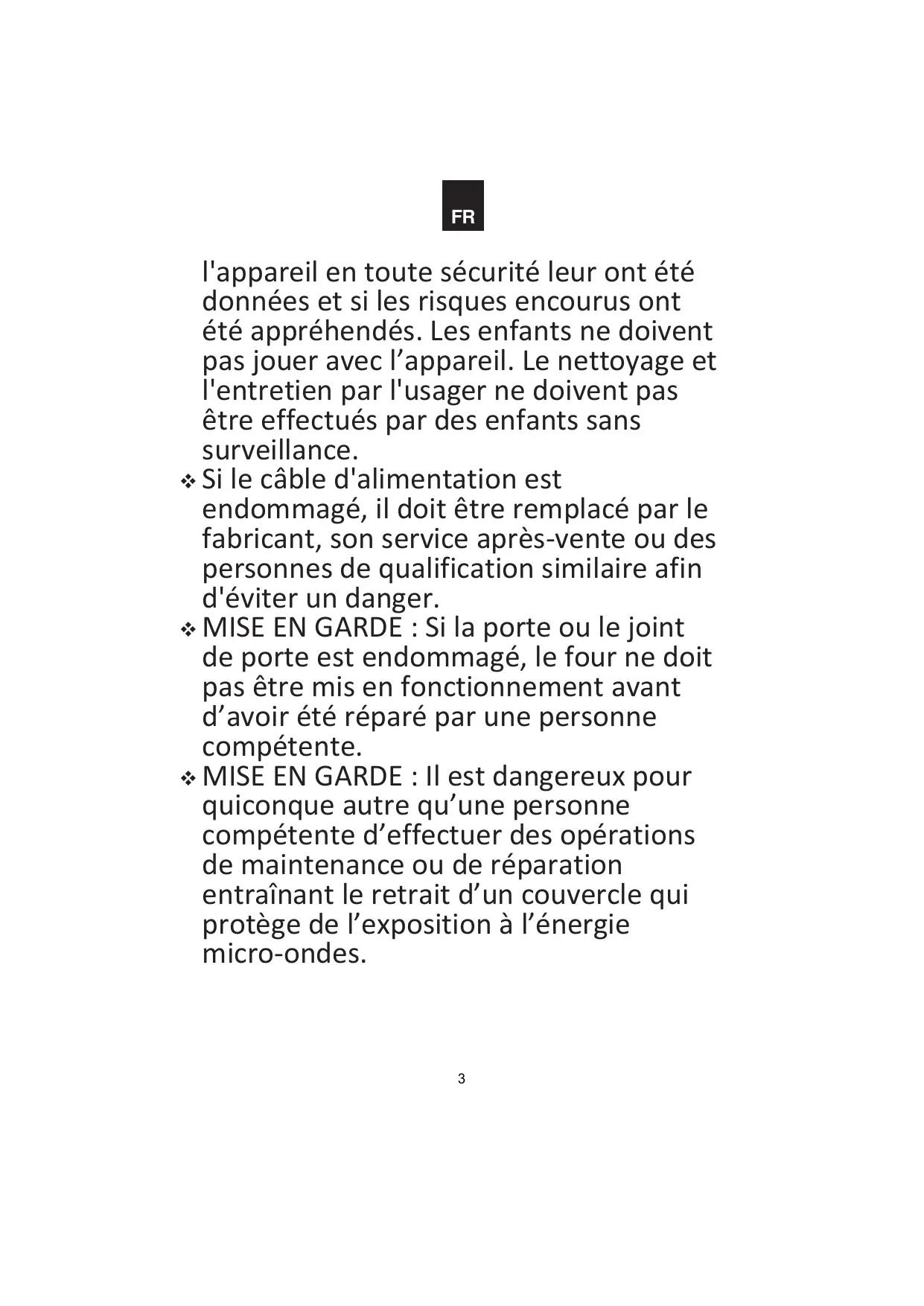 l'appareil en toute sécurité leur ont été données et si les risques encourus ont été appréhendés. Les enfants ne doivent pas jouer avec l’appareil. Le nettoyage et l'entretien par l'usager ne doivent pas être effectués par des enfants sans surveillance. Si le câble d'alimentation est endommagé, il doit être remplacé par le fabricant, son service après-vente ou des personnes de qualification similaire afin d'éviter un danger. MISE EN GARDE : Si la porte ou le joint de porte est endommagé, le four ne doit pas être mis en fonctionnement avant d’avoir été réparé par une personne compétente. MISE EN GARDE : Il est dangereux pour quiconque autre qu’une personne compétente d’effectuer des opérations de maintenance ou de réparation entraînant le retrait d’un couvercle qui protège de l’exposition à l’énergie micro-ondes.