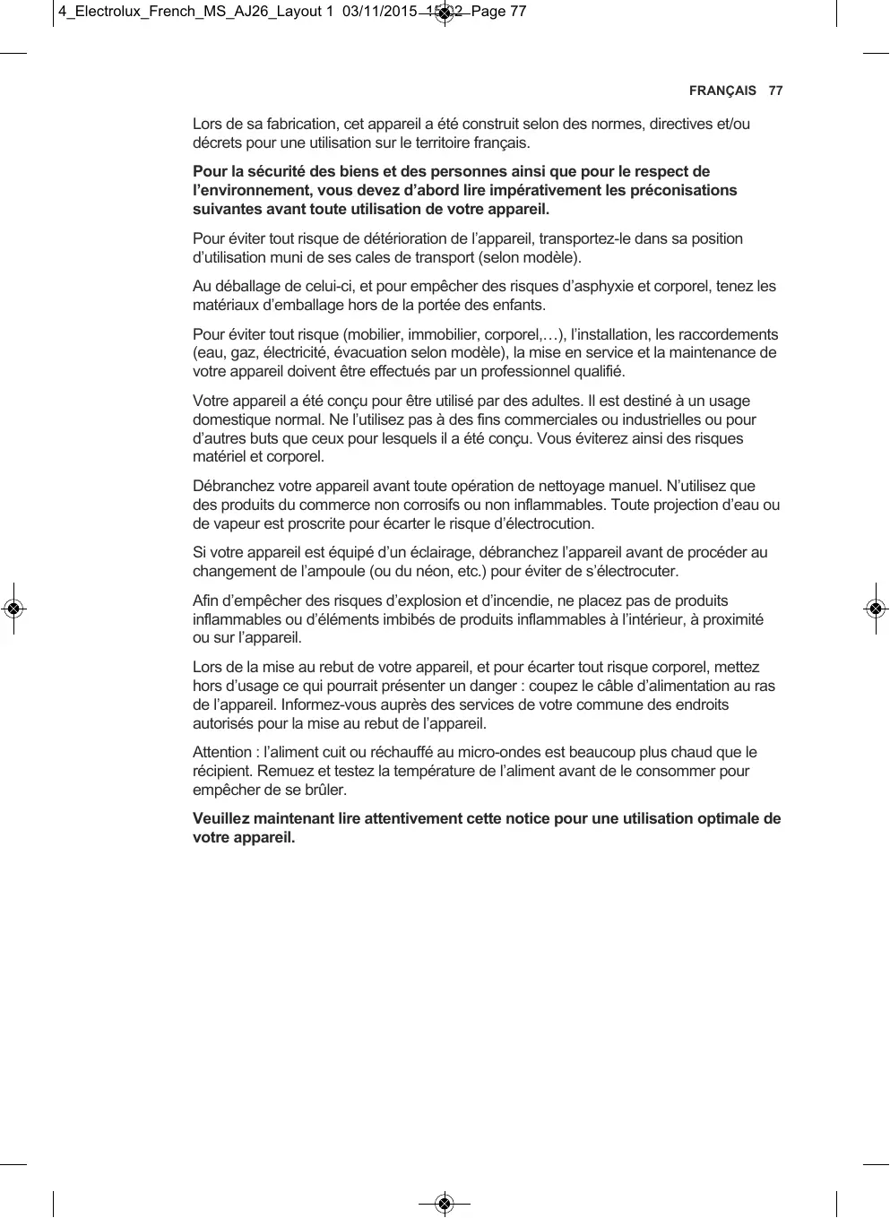 салынған құрылғыларды тұрмыстық қалдықтармен бірге тастамаңыз. Өнімді жергілікті қайта өңдеу орталығына өткізіңіз немесе жергілікті мекемеге хабарласыңыз. 4_Electrolux_French_MS_AJ26_Layout 1 03/11/2015 15:02 Page 77 FRANÇAIS 77 Lors de sa fabrication, cet appareil a été construit selon des normes, directives et/ou décrets pour une utilisation sur le territoire français. Pour la sécurité des biens et des personnes ainsi que pour le respect de l’environnement, vous devez d’abord lire impérativement les préconisations suivantes avant toute utilisation de votre appareil. Pour éviter tout risque de détérioration de l’appareil, transportez-le dans sa position d’utilisation muni de ses cales de transport (selon modèle). Au déballage de celui-ci, et pour empêcher des risques d’asphyxie et corporel, tenez les matériaux d’emballage hors de la portée des enfants. Pour éviter tout risque (mobilier, immobilier, corporel,…), l’installation, les raccordements (eau, gaz, électricité, évacuation selon modèle), la mise en service et la maintenance de votre appareil doivent être effectués par un professionnel qualifié. Votre appareil a été conçu pour être utilisé par des adultes. Il est destiné à un usage domestique normal. Ne l’utilisez pas à des fins commerciales ou industrielles ou pour d’autres buts que ceux pour lesquels il a été conçu. Vous éviterez ainsi des risques matériel et corporel. Débranchez votre appareil avant toute opération de nettoyage manuel. N’utilisez que des produits du commerce non corrosifs ou non inflammables. Toute projection d’eau ou de vapeur est proscrite pour écarter le risque d’électrocution. Si votre appareil est équipé d’un éclairage, débranchez l’appareil avant de procéder au changement de l’ampoule (ou du néon, etc.) pour éviter de s’électrocuter. Afin d’empêcher des risques d’explosion et d’incendie, ne placez pas de produits inflammables ou d’éléments imbibés de produits inflammables à l’intérieur, à proximité ou sur l’appareil. Lors de la mise au rebut de votre appareil, et pour écarter tout risque corporel, mettez hors d’usage ce qui pourrait présenter un danger : coupez le câble d’alimentation au ras de l’appareil. Informez-vous auprès des services de votre commune des endroits autorisés pour la mise au rebut de l’appareil. Attention : l’aliment cuit ou réchauffé au micro-ondes est beaucoup plus chaud que le récipient. Remuez et testez la température de l’aliment avant de le consommer pour empêcher de se brûler. Veuillez maintenant lire attentivement cette notice pour une utilisation optimale de votre appareil. 4_Electrolux_French_MS_AJ26_Layout 1 03/11/2015 15:02 Page 78 78 www.electrolux.com SOMMAIRE