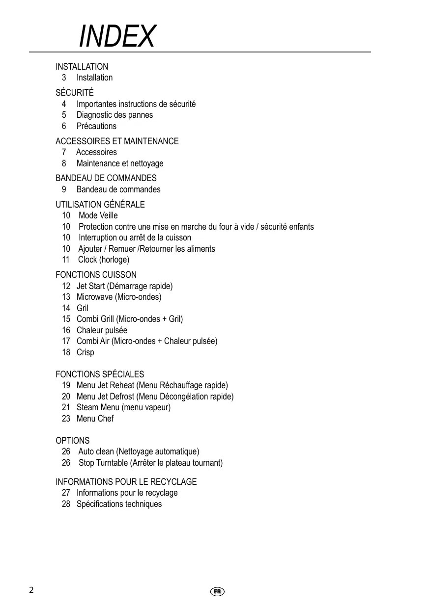 19 Menu Jet Reheat (Menu Réchauffage rapide) 20 Menu Jet Defrost (Menu Décongélation rapide) 21 Steam Menu (menu vapeur) 23 Menu Chef OPTIONS 26 Auto clean (Nettoyage automatique) 26 Stop Turntable (Arrêter le plateau tournant)