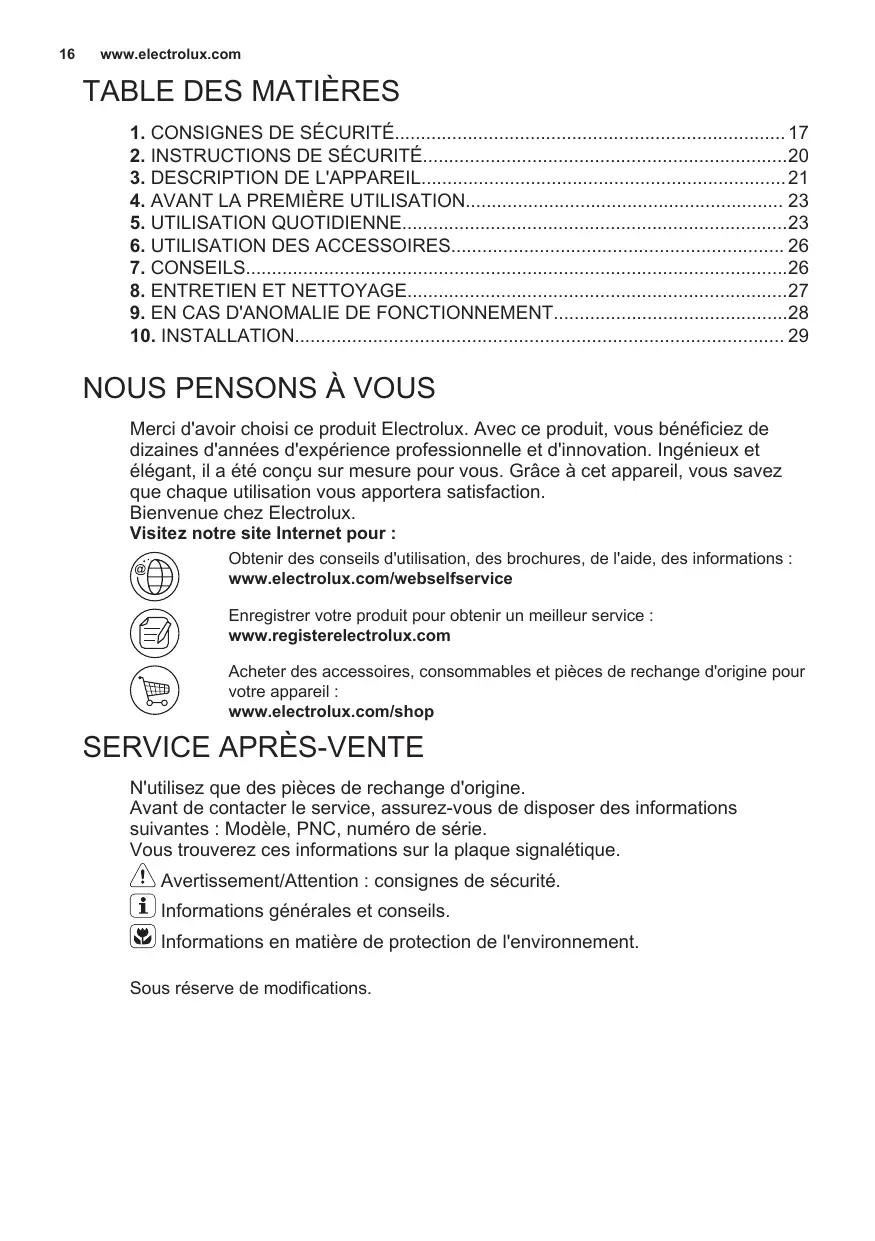 NOUS PENSONS À VOUS Merci d'avoir choisi ce produit Electrolux. Avec ce produit, vous bénéficiez de dizaines d'années d'expérience professionnelle et d'innovation. Ingénieux et élégant, il a été conçu sur mesure pour vous. Grâce à cet appareil, vous savez que chaque utilisation vous apportera satisfaction. Bienvenue chez Electrolux. Visitez notre site Internet pour :