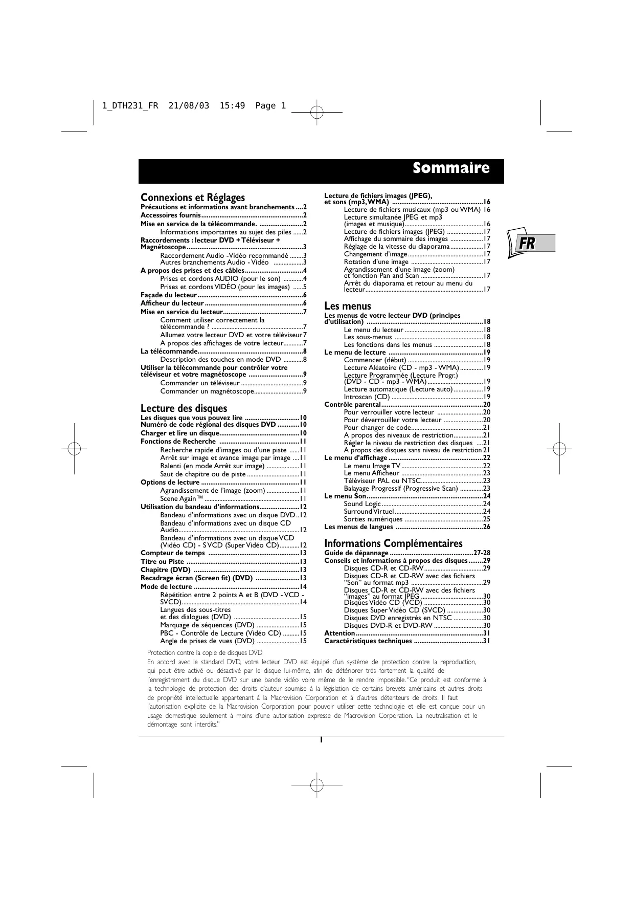 Guide de dépannage 27-28 Conseils et informations à propos des disques 29 Disques CD-R et CD-RW29 Disques CD-R et CD-RW avec des fichiers “Son” au format mp3 29 Disques CD-R et CD-RW avec des fichiers “images” au format JPEG 30 Disques Vidéo CD (VCD) 30 Disques Super Vidéo CD (SVCD) 30 Disques DVD enregistrés en NTSC 30 Disques DVD-R et DVD-RW 30 DVD • Ne le placez pas sur un amplificateur ou sur tout autre appareil produisant de la chaleur • L'appareil ne doit pas être mis en contact avec un liquide ou exposé à des éclaboussures. A cette fin, veillez à ne pas placer d'objet contenant un liquide (vase, verre, bouteille, etc....) sur, ou à proximité de votre appareil • L'appareil ne doit pas être mis en contact ou exposé à une flamme. A cette fin, veillez à ne pas placer de bougie sur, ou à proximité, de l’appareil • Protégez votre lecteur de l’humidité et de la chaleur excessive (cheminée), ainsi que de tout équipement créant de puissants champs magnétiques ou électriques (haut-parleurs...). Avant de déplacer le lecteur, assurez-vous que le tiroir à disque est vide. Passer cet appareil en mode veille n’interrompt pas son alimentation électrique. Pour le séparer complètement du secteur débranchez-le de sa prise d’alimentation, ce qui est conseillé si vous ne l’utilisez pas pendant un certain temps. Lors du branchement, assurez-vous de bien enfoncer les fiches des différents cordons dans les prises correspondantes.Votre lecteur n’est pas conçu pour une utilisation industrielle, mais pour une utilisation familiale. L’usage de cet appareil est destiné à des fins purement privées. Copier ou télécharger des fichiers musicaux à des fins de commercialisation ou pour tout autre but lucratif constitue ou pourrait constituer une violation du code de la propriété Intellectuelle. Important : Veuillez également prendre connaissance des autres recommandations en page 31.