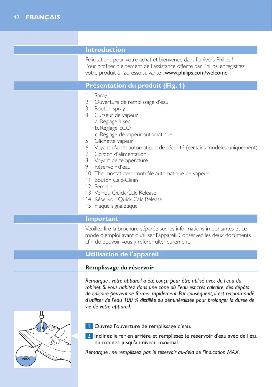 Remplissage du réservoir Remarque : votre appareil a été conçu pour être utilisé avec de l'eau du robinet. Si vous habitez dans une zone où l'eau est très calcaire, des dépôts de calcaire peuvent se former rapidement. Par conséquent, il est recommandé d'utiliser de l'eau 100 % distillée ou déminéralisée pour prolonger la durée de vie de votre appareil. 1 Ouvrez l'ouverture de remplissage d'eau. 2 Inclinez le fer en arrière et remplissez le réservoir d'eau avec de l'eau du robinet, jusqu'au niveau maximal. Remarque : ne remplissez pas le réservoir au-delà de l'indication MAX.