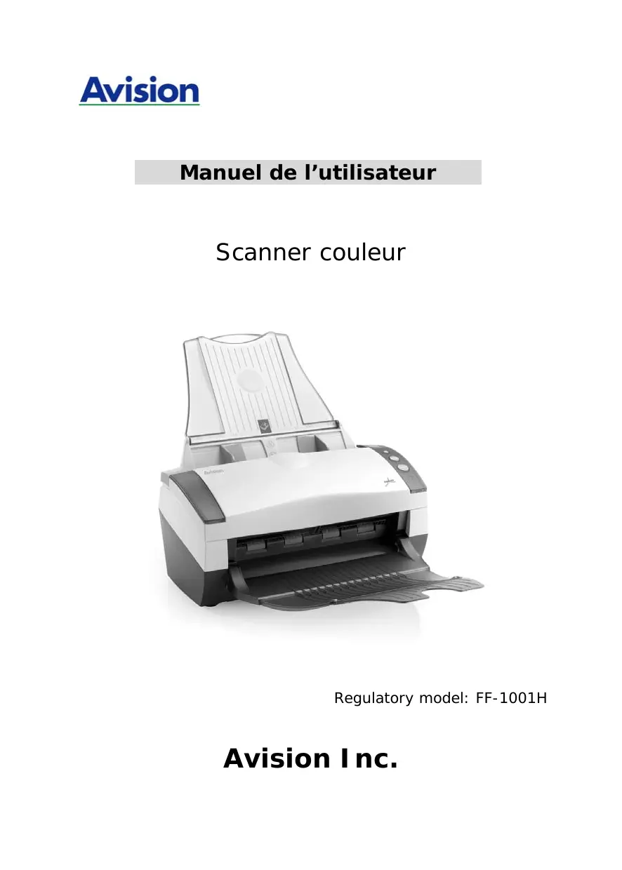 Manuel de l’utilisateur Scanner couleur Regulatory model: FF-1001H Avision Inc. Marques déposées Microsoft est une marque déposée aux Etats-Unis de Microsoft Corporation. Windows et MS DOS sont des marques de Microsoft Corporation. IBM, IBM PC sont des marques déposées d’International Business Machines Corp. Les autres marques et produits cités sont des marques déposées ou des marques de leurs propriétaires respectifs. Droits d’auteurs Tous droits réservés. Aucune partie de cette publication ne peut être reproduite, transmise, transcrite, stockée dans un système d’archivage, ou traduite dans n’importe quelle langue ou n’importe quel langage de programmation, sous n’importe quelle forme ou par n’importe quels moyens, électroniques, mécaniques, magnétiques, optiques, chimiques, manuels, ou autres, sans la permission par écrit de Avision Inc. Le matériel scanné par ce produit peut être protégé par des lois gouvernementales et autres règlements, tel que lois de droits d’auteur. C’est l’unique responsabilité de l’utilisateur de se conformer à de telles lois et règlements. Garantie Les informations contenues dans ce document sont sujettes à des modifications sans préavis. Avision ne fait pas de garantie de n’importe quel genre en ce qui concerne ce matériel, y compris, mais sans limitations, la garantie impliquée de convenance dans un but déterminé. Avision décline toute responsabilité pour toute erreur contenue ciaprès, ou pour tout dommage accessoire ou indirect résultant de la fourniture, performance, ou utilisation de ce matériel.