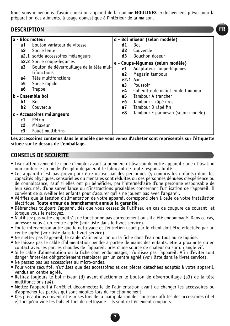 Nous vous remercions d’avoir choisi un appareil de la gamme MOULINEX exclusivement prévu pour la préparation des aliments, à usage domestique à l’intérieur de la maison.