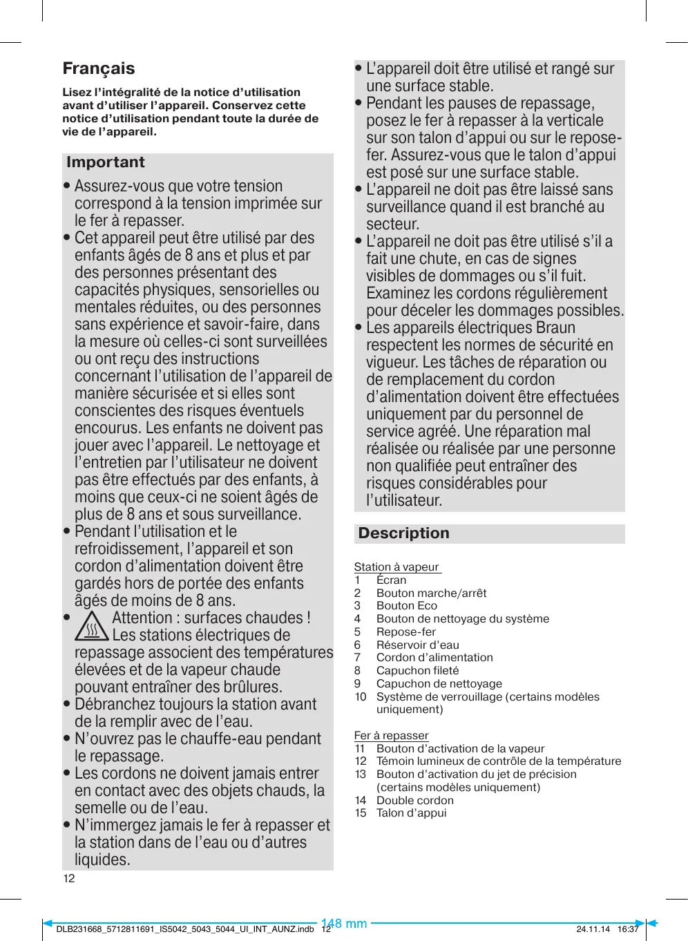 Pendant les pauses de repassage, posez le fer à repasser à la verticale sur son talon d’appui ou sur le reposefer. Assurez-vous que le talon d’appui est posé sur une surface stable. L’appareil ne doit pas être laissé sans surveillance quand il est branché au secteur. L’appareil ne doit pas être utilisé s’il a fait une chute, en cas de signes visibles de dommages ou s’il fuit. Examinez les cordons régulièrement pour déceler les dommages possibles. Les appareils électriques Braun respectent les normes de sécurité en vigueur. Les tâches de réparation ou de remplacement du cordon d’alimentation doivent être effectuées uniquement par du personnel de service agréé. Une réparation mal réalisée ou réalisée par une personne non qualifiée peut entraîner des risques considérables pour l’utilisateur. Description Station à vapeur 1 Écran 2 Bouton marche/arrêt 3 Bouton Eco 4 Bouton de nettoyage du système 5 Repose-fer 6 Réservoir d’eau 7 Cordon d’alimentation 8 Capuchon fileté 9 Capuchon de nettoyage 10 Système de verrouillage (certains modèles uniquement) Fer à repasser 11 Bouton d’activation de la vapeur 12 Témoin lumineux de contrôle de la température 13 Bouton d’activation du jet de précision (certains modèles uniquement) 14 Double cordon 15 Talon d’appui