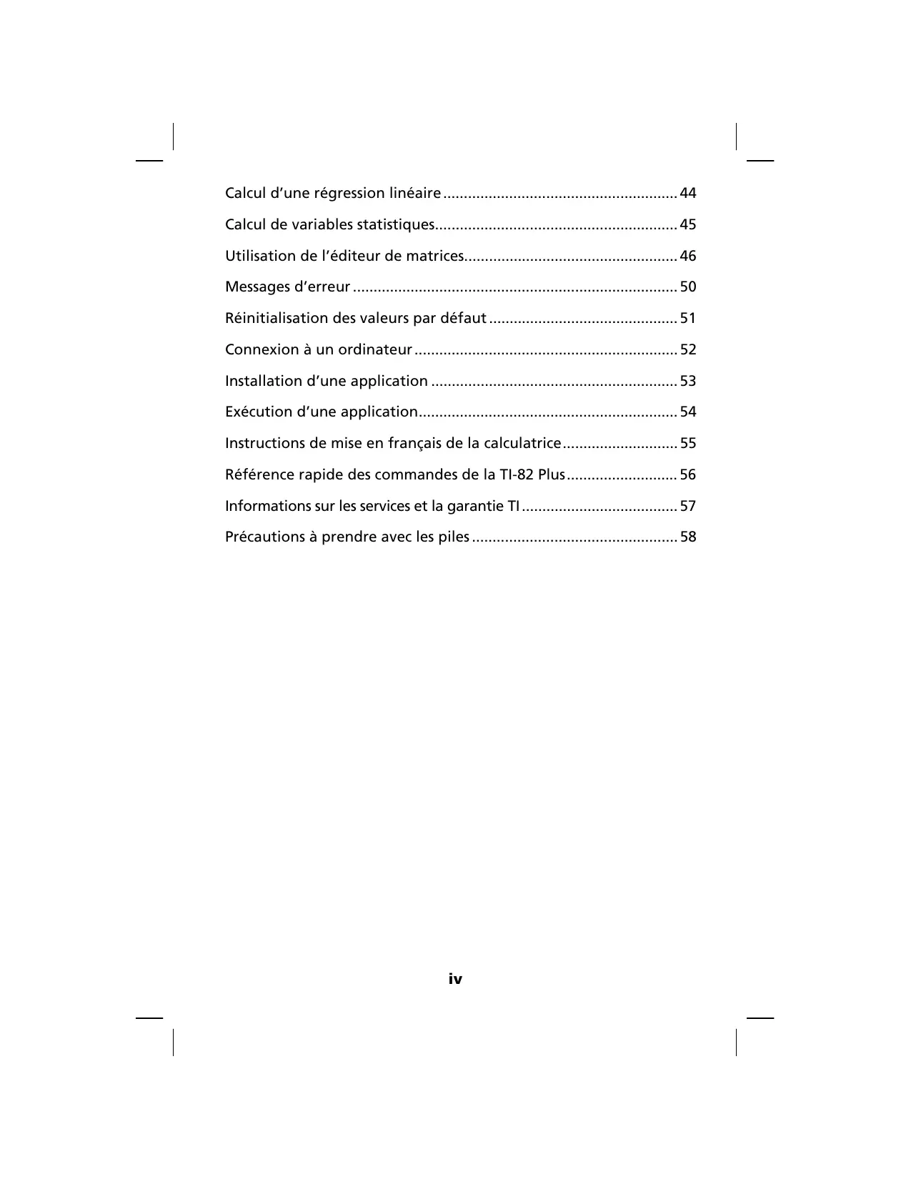 aux étudiants qui souhaitent disposer d’un récapitulatif des procédures d’exécution des opérations communes sur la TI-82 Plus. Ce manuel présente rapidement les différentes rubriques proposées en indiquant les séquences de touches utilisées pour faciliter la compréhension des exemples. Tous les exemples fournis supposent l'utilisation des paramètres par défaut de la TI-82 Plus.