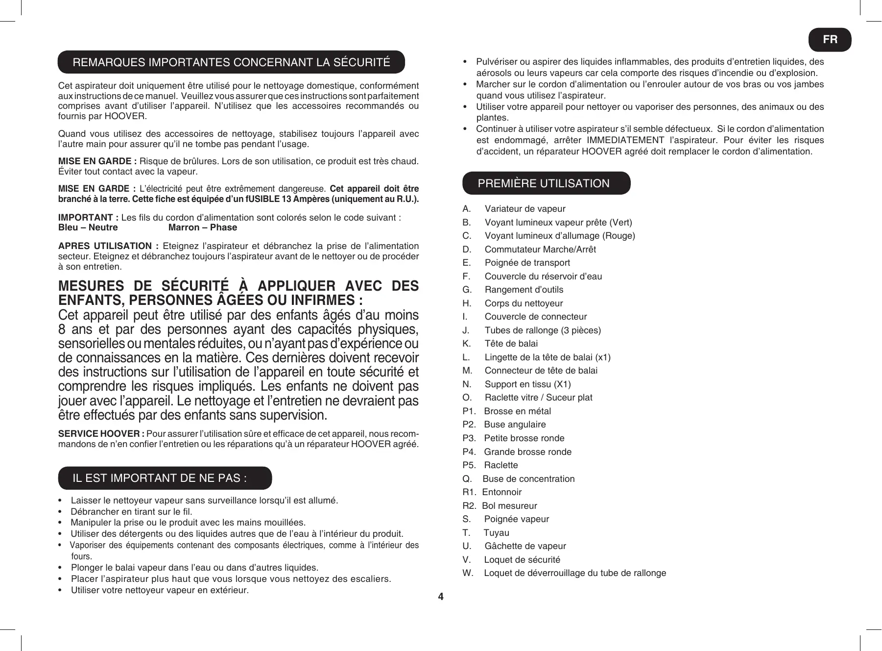 Quand vous utilisez des accessoires de nettoyage, stabilisez toujours l’appareil avec l’autre main pour assurer qu’il ne tombe pas pendant l’usage. MISE EN GARDE : Risque de brûlures. Lors de son utilisation, ce produit est très chaud. Éviter tout contact avec la vapeur. Première utilisation MISE EN GARDE : L’électricité peut être extrêmement dangereuse. Cet appareil doit être branché à la terre. Cette fiche est équipée d’un fusible 13 ampères (uniquement au R.U.). Important : Les fils du cordon d’alimentation sont colorés selon le code suivant : Bleu – Neutre Marron – Phase APRES UTILISATION : Eteignez l’aspirateur et débranchez la prise de l’alimentation secteur. Eteignez et débranchez toujours l’aspirateur avant de le nettoyer ou de procéder à son entretien. MESURES DE SÉCURITÉ À APPLIQUER AVEC DES ENFANTS, PERSONNES ÂGÉES OU INFIRMES : Cet appareil peut être utilisé par des enfants âgés d’au moins 8 ans et par des personnes ayant des capacités physiques, sensorielles ou mentales réduites, ou n’ayant pas d’expérience ou de connaissances en la matière. Ces dernières doivent recevoir des instructions sur l’utilisation de l’appareil en toute sécurité et comprendre les risques impliqués. Les enfants ne doivent pas jouer avec l’appareil. Le nettoyage et l’entretien ne devraient pas être effectués par des enfants sans supervision. SERVICE HOOVER : Pour assurer l’utilisation sûre et efficace de cet appareil, nous recommandons de n’en confier l’entretien ou les réparations qu’à un réparateur HOOVER agréé. Il est important de ne pas :