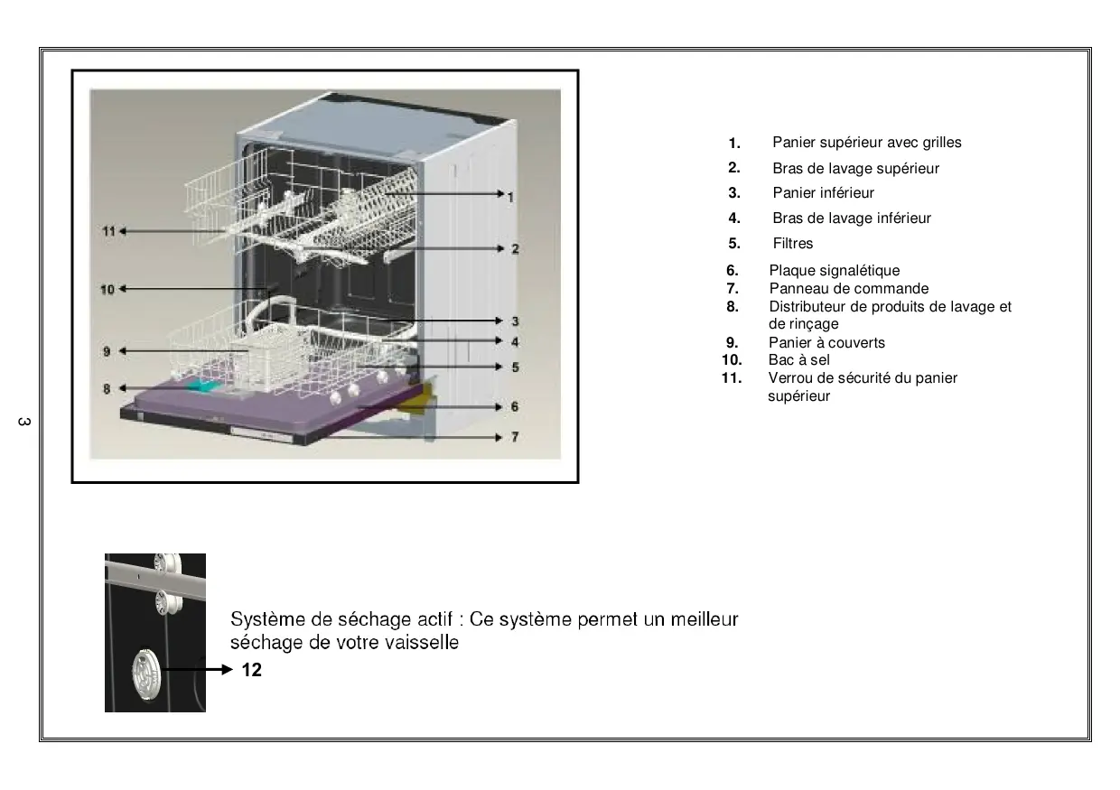 fabricant, son agent de service ou un technicien qualifié afin d'éviter tout danger. Cet appareil n'est pas destiné, à être utilisé par des personnes (notamment des enfants ) dont les capacités physiques, sensorielles ou intellectuelles sont réduites, ou par des personnes manquant d'expérience ou de connaissances, à moins que celles-ci ne soient sous surveillance ou qu'elles aient reçu des instructions quant à l'utilisation de l'appareil par une personne responsable de leur sécurité. • Si l'option EnergySave est sélectionnée sur « Oui », la porte s’ouvrira à la fin du programme. Ne forcez pas sur la porte lors de la fermeture pour éviter d’endommager le mécanisme de la porte automatique pendant 1 minute Pour un séchage optimal, laissez la porte ouverte pendant 20 minutes.(pour les modèles avec système automatique d’ouverture de porte Avertissement : Évitez de vous tenir devant la porte lorsque que le signal sonore d’ouverture automatique rétentit. Pour la sécurité des enfants • Après le déballage du lave-vaisselle, veillez à tenir les matériaux d'emballage hors de portée des enfants. • Ne laissez pas les enfants jouer avec ou mettre en marche le lave-vaisselle. • Rangez les détergents et produits de rinçage hors de portée des enfants. • Tenir les enfants à l'écart du lave-vaisselle lorsqu’il est qu'elle est ouvert : il peut contenir des résidus de substances de nettoyage. • Veillez à ce que votre ancien lave-vaisselle ne pose aucun risque à vos enfants. Il est arrivé que des enfants s'enferment 9