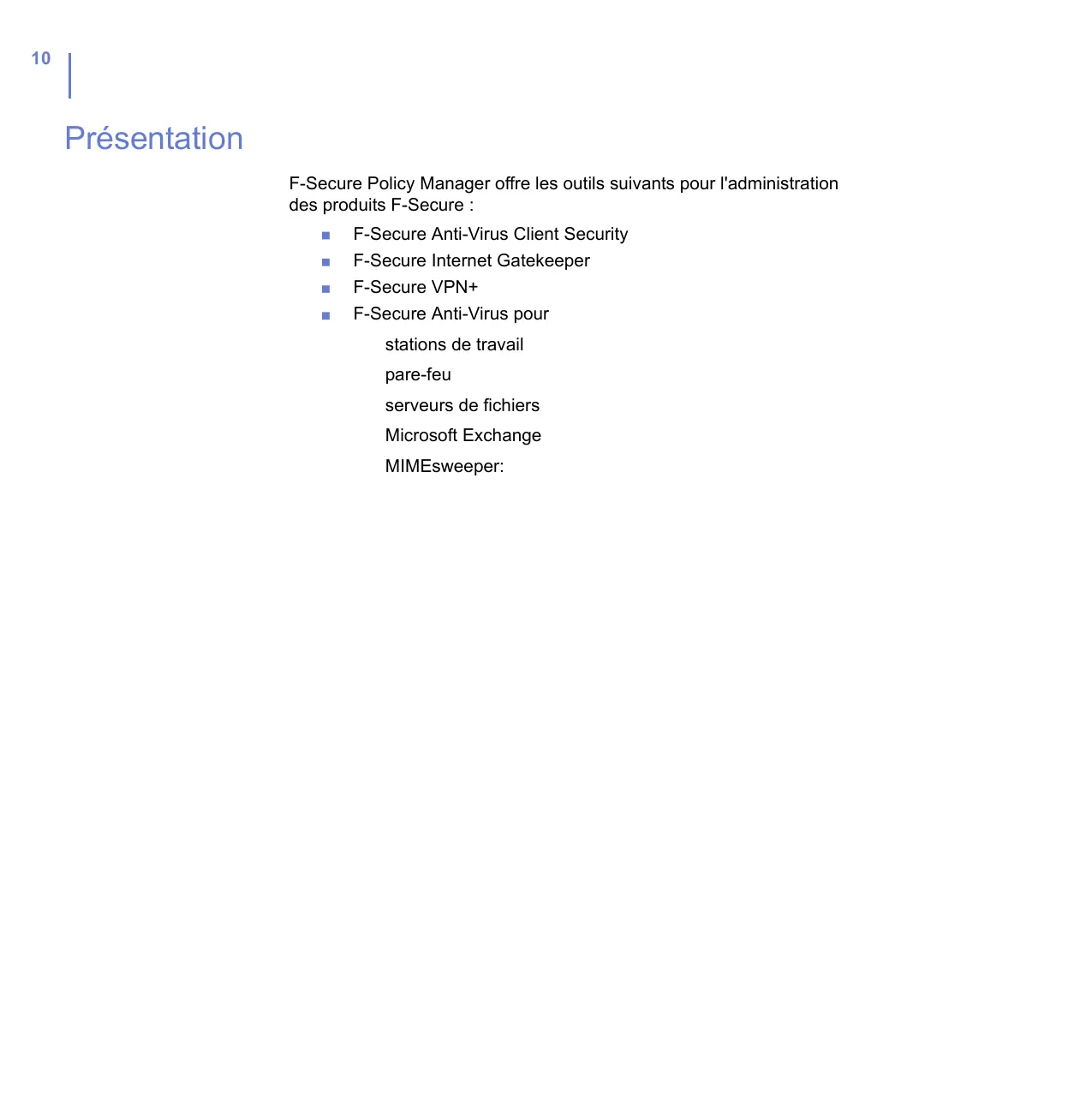 Présentation F-Secure Policy Manager offre les outils suivants pour l'administration des produits F-Secure :