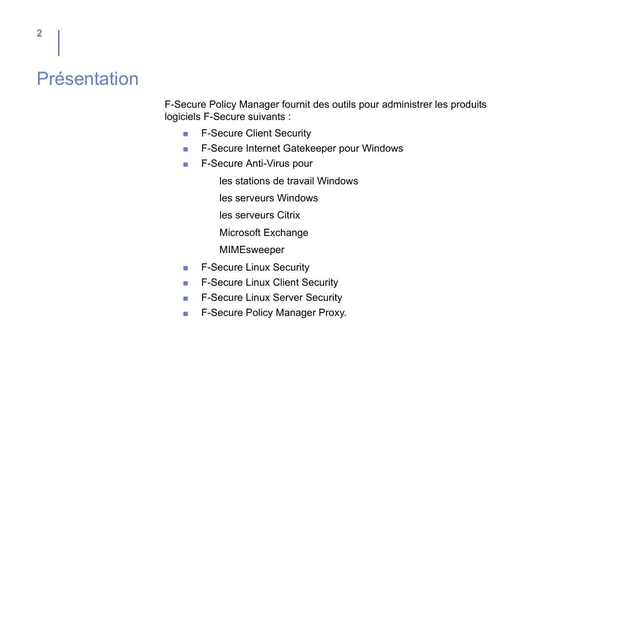 Présentation F-Secure Policy Manager fournit des outils pour administrer les produits logiciels F-Secure suivants : F-Secure Client Security F-Secure Internet Gatekeeper pour Windows F-Secure Anti-Virus pour les stations de travail Windows les serveurs Windows les serveurs Citrix Microsoft Exchange MIMEsweeper F-Secure Linux Security F-Secure Linux Client Security F-Secure Linux Server Security F-Secure Policy Manager Proxy. A propos de ce guide Organisation du guide Le Guide de l'administrateur de F-Secure Policy Manager contient les chapitres suivants.