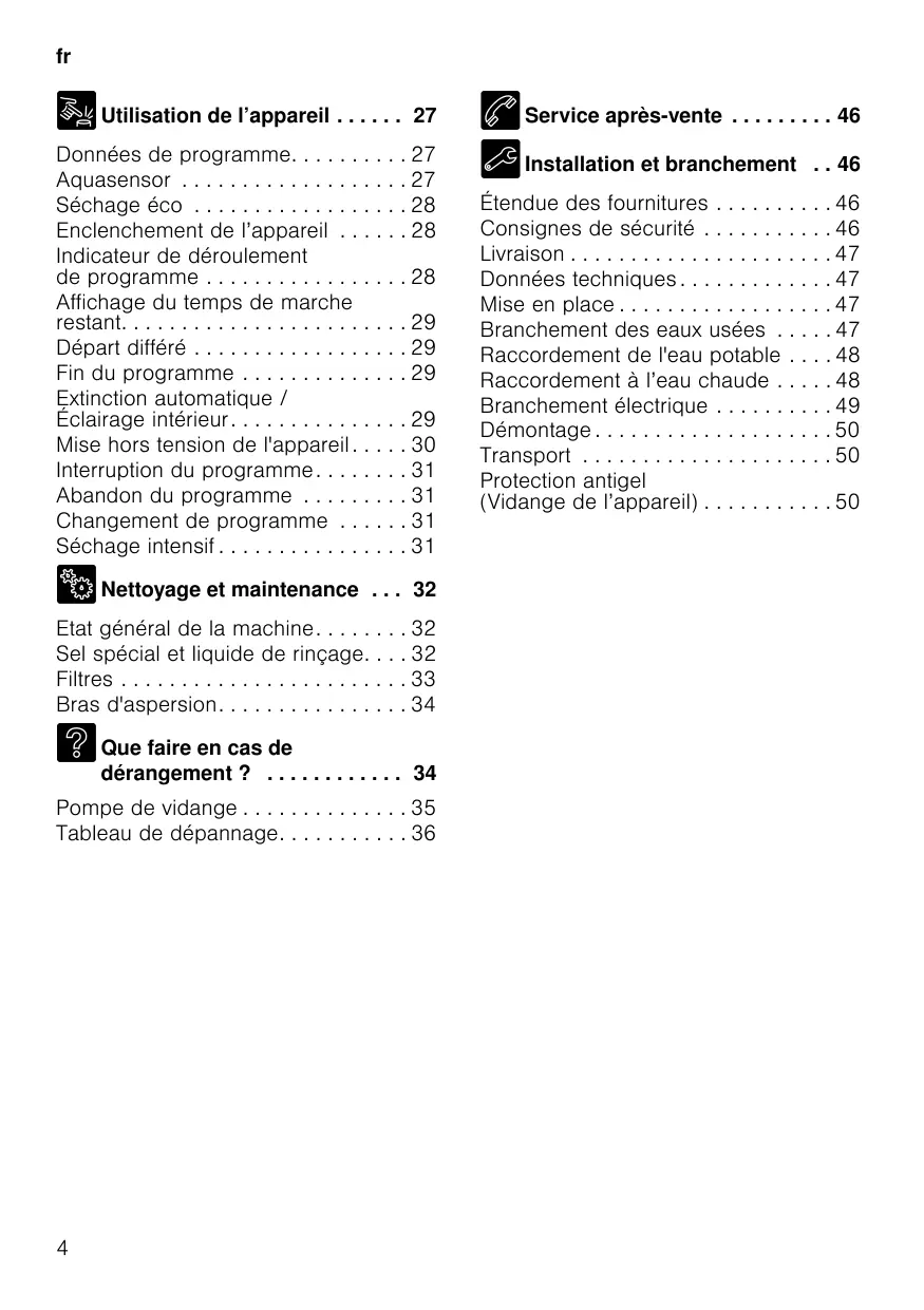 3 Que faire en cas de dérangement ? . . . . . . . . . . . . 34 Pompe de vidange . . . . . . . . . . . . . . 35 Tableau de dépannage. . . . . . . . . . . 36