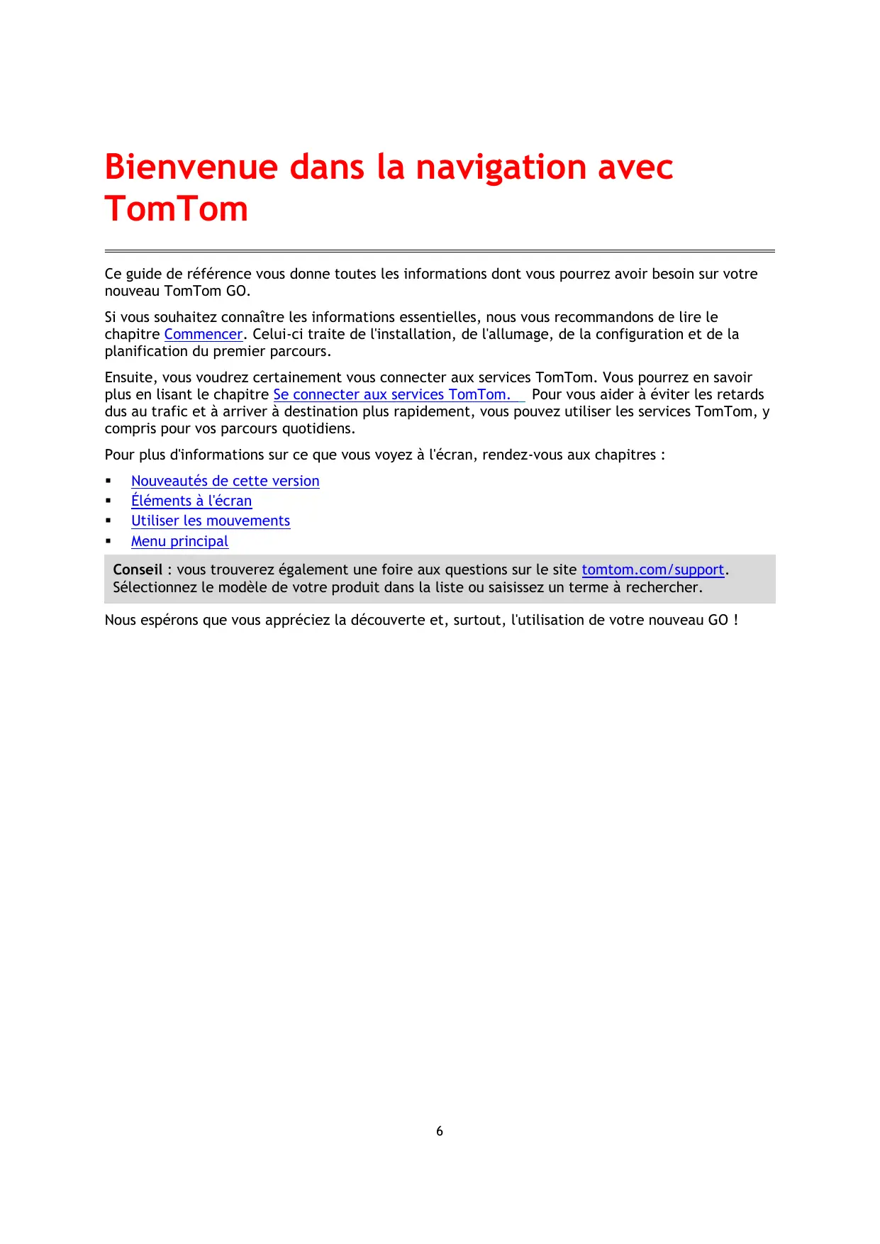 Nouveautés de cette version Éléments à l'écran Utiliser les mouvements Menu principal Conseil : vous trouverez également une foire aux questions sur le site tomtom.com/support. Sélectionnez le modèle de votre produit dans la liste ou saisissez un terme à rechercher. Nous espérons que vous appréciez la découverte et, surtout, l'utilisation de votre nouveau GO !