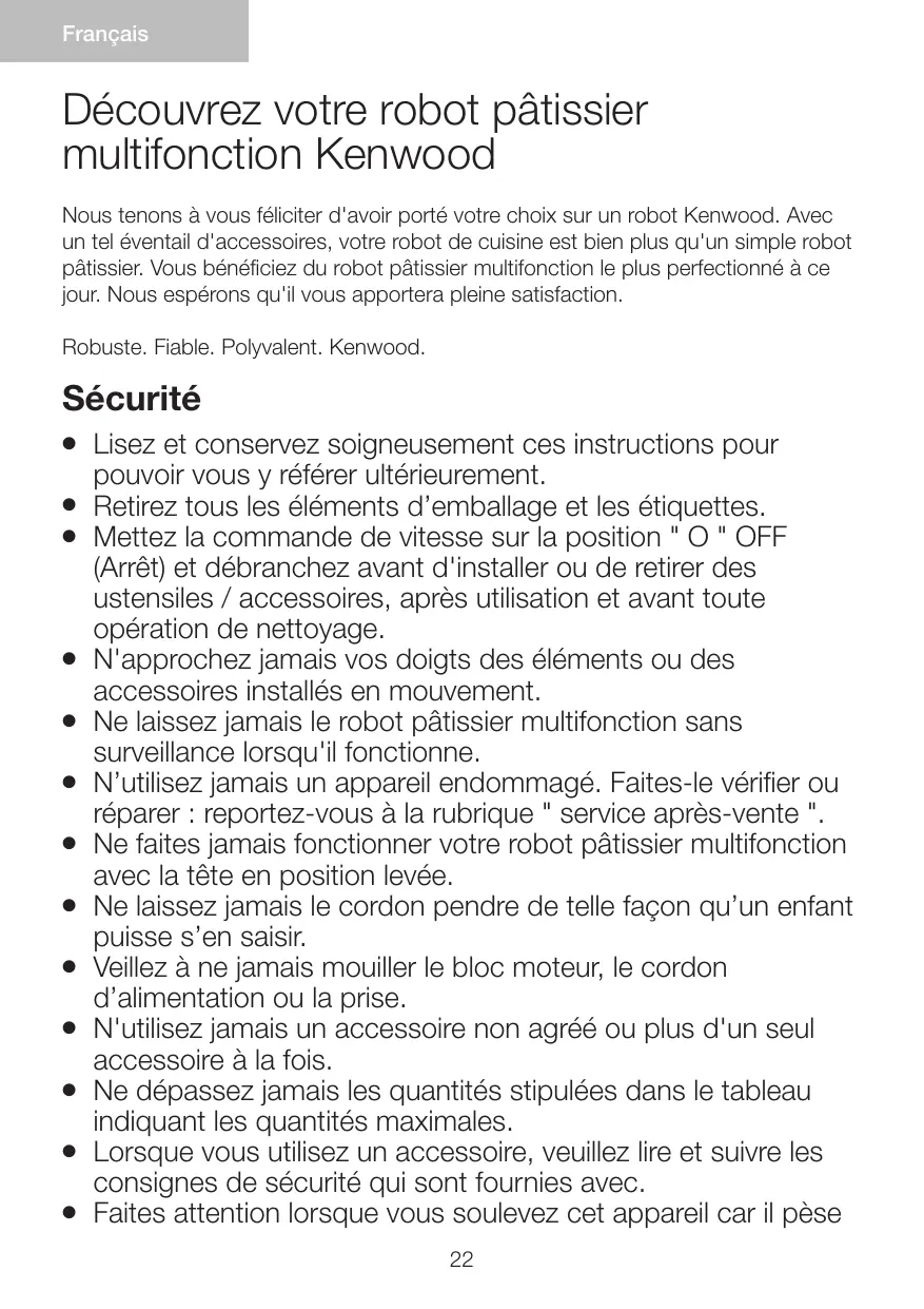 Découvrez votre robot pâtissier multifonction Kenwood Nous tenons à vous féliciter d'avoir porté votre choix sur un robot Kenwood. Avec un tel éventail d'accessoires, votre robot de cuisine est bien plus qu'un simple robot pâtissier. Vous bénéficiez du robot pâtissier multifonction le plus perfectionné à ce jour. Nous espérons qu'il vous apportera pleine satisfaction. Robuste. Fiable. Polyvalent. Kenwood. Sécurité