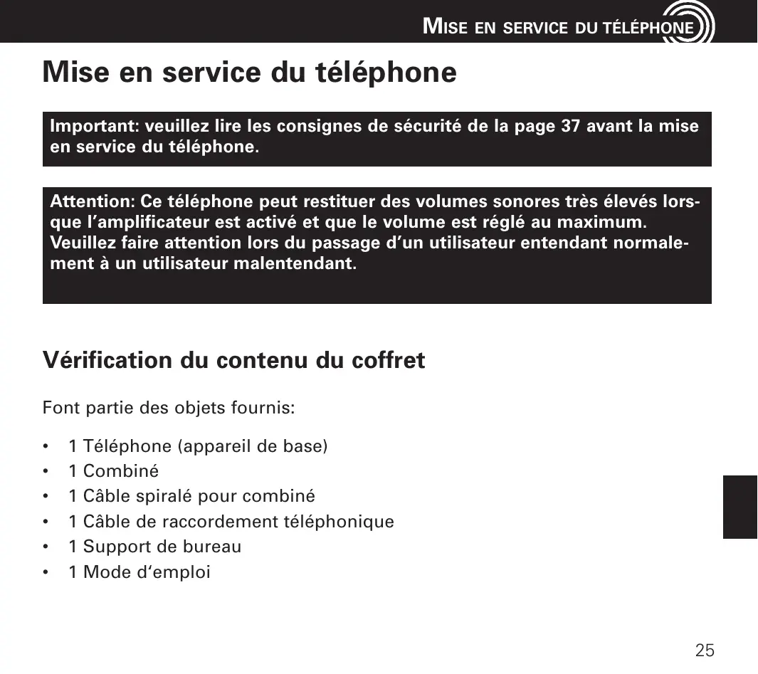 NEHMEN Mise en service du téléphone Important: veuillez lire les consignes de sécurité de la page 37 avant la mise en service du téléphone. Attention: Ce téléphone peut restituer des volumes sonores très élevés lorsque l’amplificateur est activé et que le volume est réglé au maximum. Veuillez faire attention lors du passage d’un utilisateur entendant normalement à un utilisateur malentendant. Vérification du contenu du coffret Font partie des objets fournis: