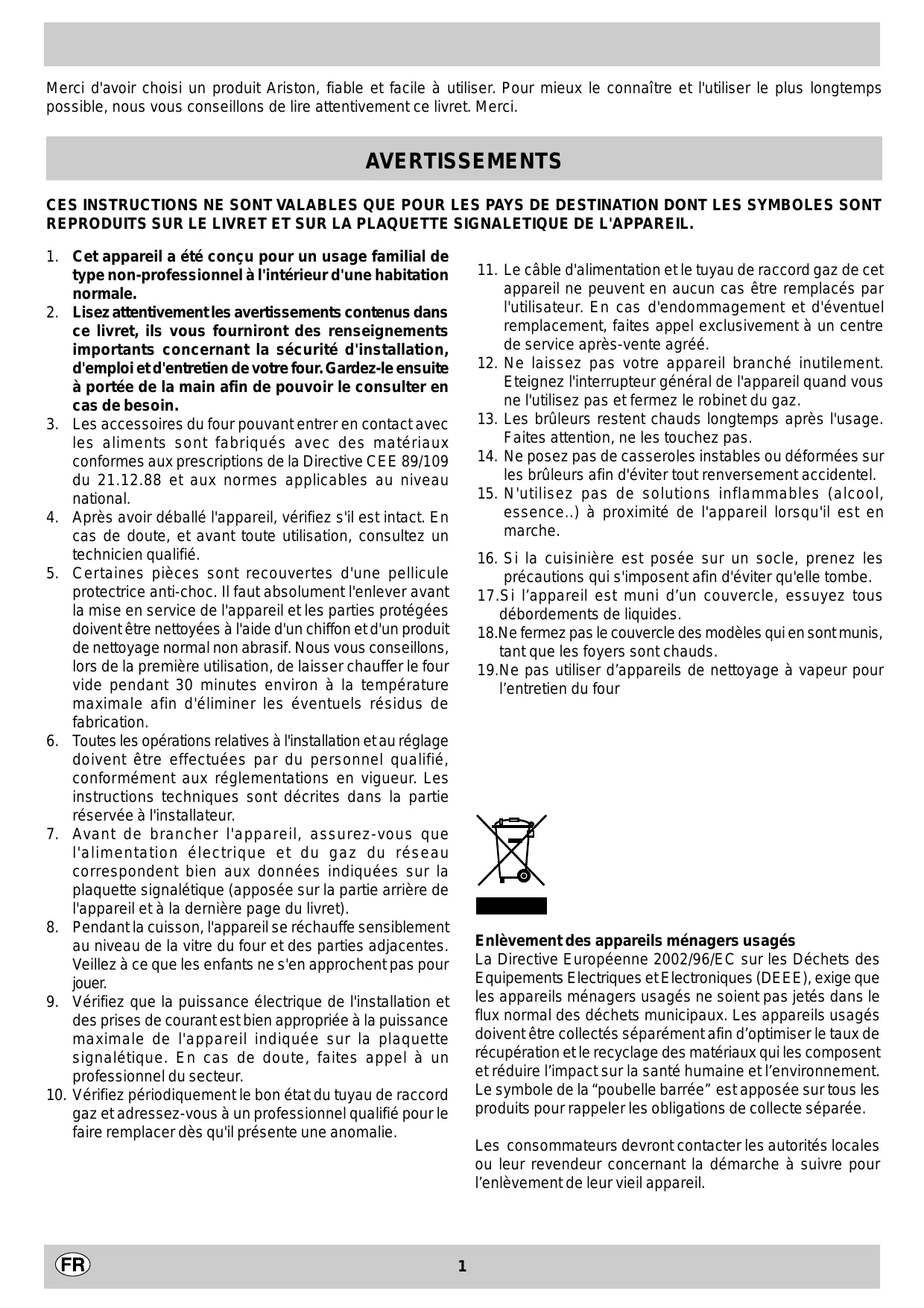 précautions qui s'imposent afin d'éviter qu'elle tombe. 17.Si l’appareil est muni d’un couvercle, essuyez tous débordements de liquides. 18.Ne fermez pas le couvercle des modèles qui en sont munis, tant que les foyers sont chauds. 19.Ne pas utiliser d’appareils de nettoyage à vapeur pour l’entretien du four Enlèvement des appareils ménagers usagés La Directive Européenne 2002/96/EC sur les Déchets des Equipements Electriques et Electroniques (DEEE), exige que les appareils ménagers usagés ne soient pas jetés dans le flux normal des déchets municipaux. Les appareils usagés doivent être collectés séparément afin d’optimiser le taux de récupération et le recyclage des matériaux qui les composent et réduire l’impact sur la santé humaine et l’environnement. Le symbole de la ‘‘poubelle barrée’’ est apposée sur tous les produits pour rappeler les obligations de collecte séparée. Les consommateurs devront contacter les autorités locales ou leur revendeur concernant la démarche à suivre pour l’enlèvement de leur vieil appareil.