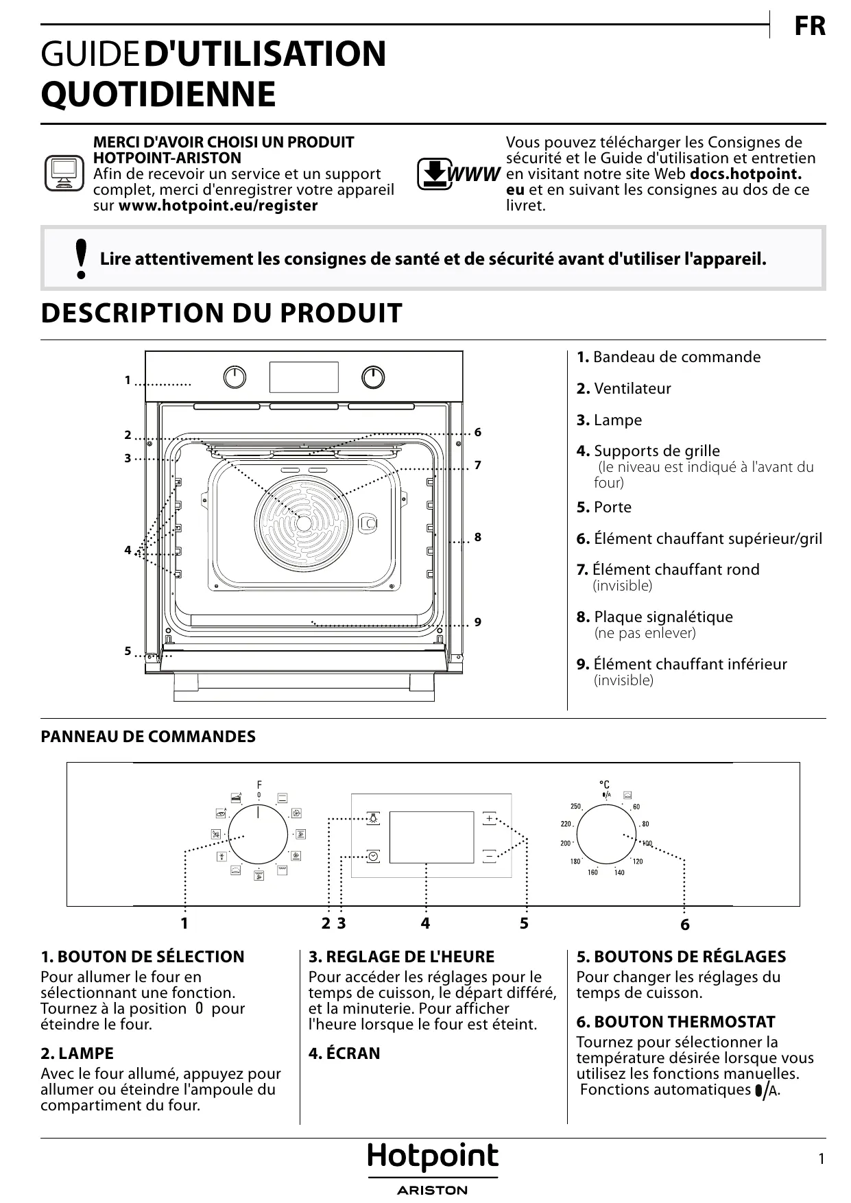 HOTPOINT-ARISTON Afin de recevoir un service et un support complet, merci d'enregistrer votre appareil sur www.hotpoint.eu/register WWW Vous pouvez télécharger les Consignes de sécurité et le Guide d'utilisation et entretien en visitant notre site Web docs.hotpoint. eu et en suivant les consignes au dos de ce livret. Lire attentivement les consignes de santé et de sécurité avant d'utiliser l'appareil.