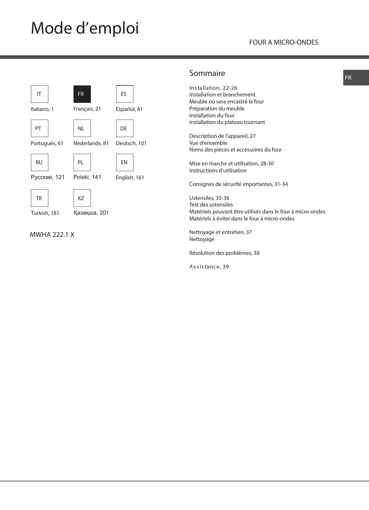 Retrouvez gratuitement la notice de l'appareil MWHA1221X HOTPOINT au format PDF.