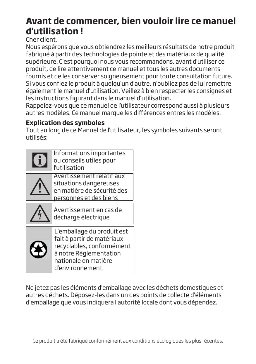 Informations importantes ou conseils utiles pour l'utilisation Avertissement relatif aux situations dangereuses en matière de sécurité des personnes et des biens Avertissement en cas de décharge électrique L’emballage du produit est fait à partir de matériaux recyclables, conformément à notre Règlementation nationale en matière d'environnement. Ne jetez pas les éléments d’emballage avec les déchets domestiques et autres déchets. Déposez-les dans un des points de collecte d’éléments d’emballage que vous indiquera l’autorité locale dont vous dépendez. Ce produit a été fabriqué conformément aux conditions écologiques les plus récentes.