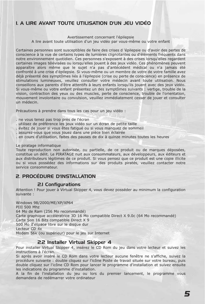 Attention ! Pour jouer à Virtual Skipper 4, vous devez posséder au minimum la configuration suivante : Windows 98/2000/ME/XP/XP64 PIII 500 Mhz 64 Mo de Ram (256 Mo recommandé) Carte graphique accélératrice 3D 16 Mo compatible Direct X 9.0c (64 Mo recommandé) Carte Son 16 Bits compatible Direct X 9 500 Mo d'espace libre sur le disque dur Lecteur CD 4x Modem 56k (ou supérieur) pour le jeu sur Internet