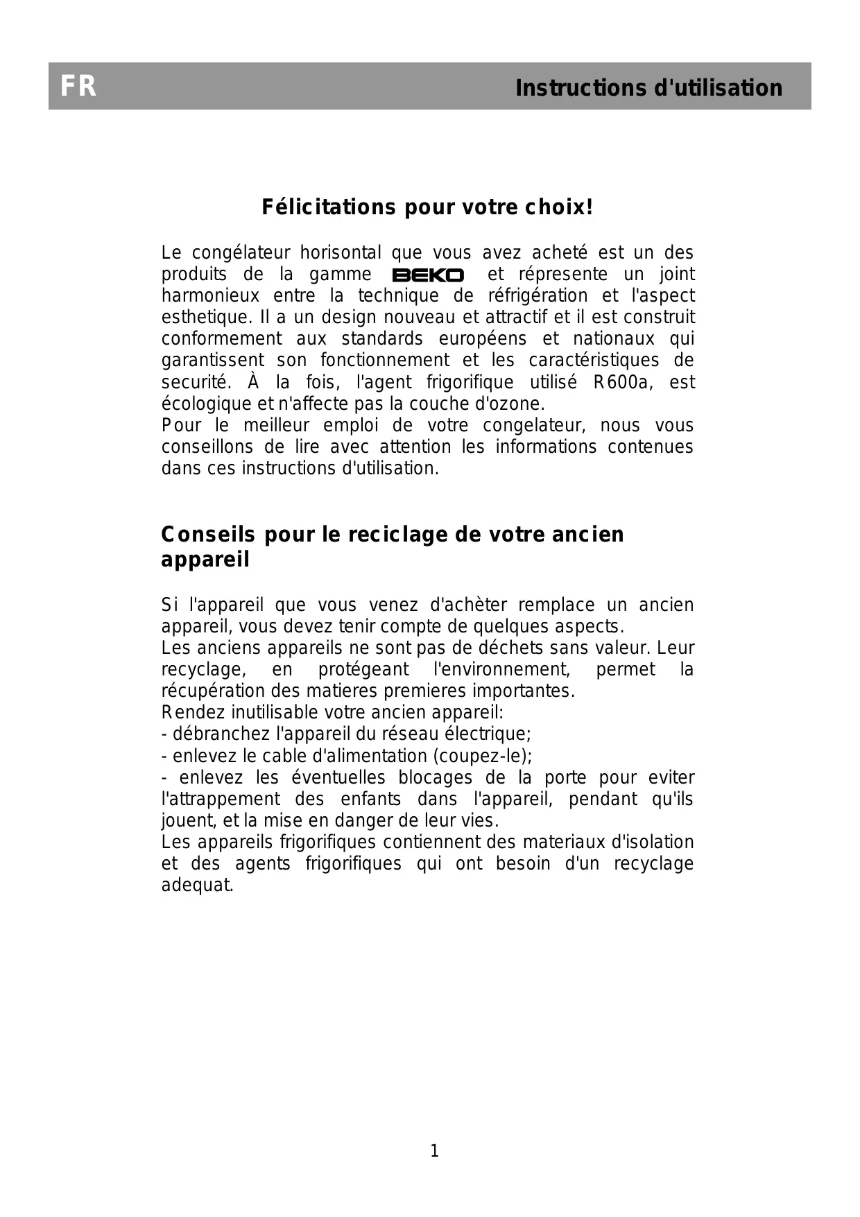 Instructions d'utilisation Félicitations pour votre choix! Le congélateur horisontal que vous avez acheté est un des et répresente un joint produits de la gamme BEKO harmonieux entre la technique de réfrigération et l'aspect esthetique. Il a un design nouveau et attractif et il est construit conformement aux standards européens et nationaux qui garantissent son fonctionnement et les caractéristiques de securité. À la fois, l'agent frigorifique utilisé R600a, est écologique et n'affecte pas la couche d'ozone. Pour le meilleur emploi de votre congelateur, nous vous conseillons de lire avec attention les informations contenues dans ces instructions d'utilisation. Conseils pour le reciclage de votre ancien appareil Si l'appareil que vous venez d'achèter remplace un ancien appareil, vous devez tenir compte de quelques aspects. Les anciens appareils ne sont pas de déchets sans valeur. Leur recyclage, en protégeant l'environnement, permet la récupération des matieres premieres importantes. Rendez inutilisable votre ancien appareil: - débranchez l'appareil du réseau électrique; - enlevez le cable d'alimentation (coupez-le); - enlevez les éventuelles blocages de la porte pour eviter l'attrappement des enfants dans l'appareil, pendant qu'ils jouent, et la mise en danger de leur vies. Les appareils frigorifiques contiennent des materiaux d'isolation et des agents frigorifiques qui ont besoin d'un recyclage adequat.