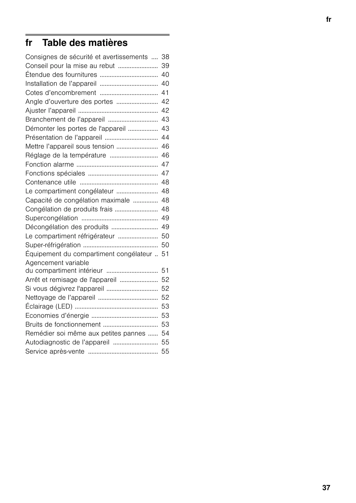 Table des matières frNotice de montage t d’utilsation Consignes de sécurité et avertissements .... Conseil pour la mise au rebut ........................ Étendue des fournitures ................................... Installation de l’appareil ................................... Cotes d’encombrement ................................... Angle d’ouverture des portes ......................... Ajuster l’appareil ................................................ Branchement de l’appareil .............................. Démonter les portes de l'appareil .................. Présentation de l’appareil ................................ Mettre l’appareil sous tension ......................... Réglage de la température ............................. Fonction alarme ................................................. Fonctions spéciales .......................................... Contenance utile ............................................... Le compartiment congélateur ......................... Capacité de congélation maximale ............... Congélation de produits frais .......................... Supercongélation .............................................. Décongélation des produits ............................ Le compartiment réfrigérateur ........................ Super-réfrigération ............................................. Équipement du compartiment congélateur .. Agencement variable du compartiment intérieur ............................... Arrêt et remisage de l'appareil ....................... Si vous dégivrez l'appareil ............................... Nettoyage de l’appareil .................................... Éclairage (LED) .................................................. Economies d’énergie ........................................ Bruits de fonctionnement ................................. Remédier soi même aux petites pannes ...... Autodiagnostic de l’appareil ........................... Service après-vente ..........................................