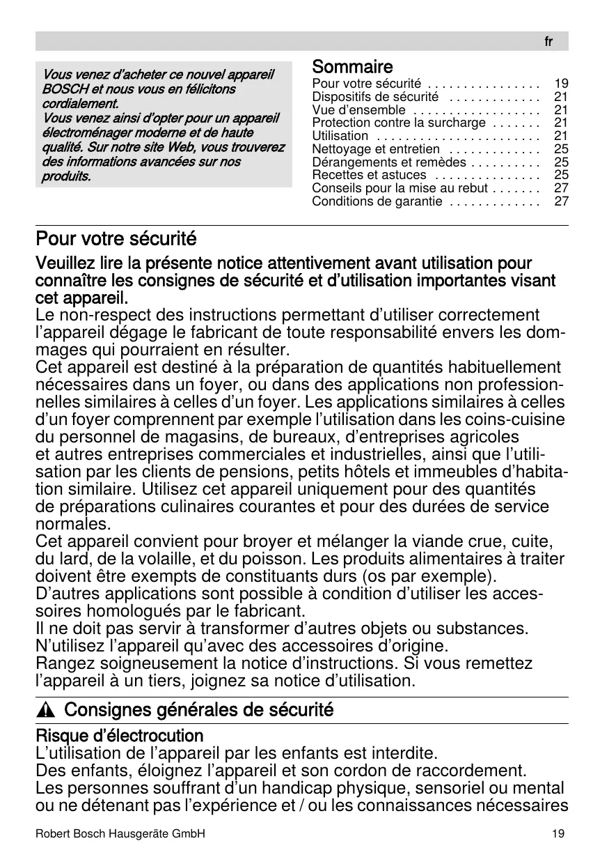 Pour votre sécurité Veuillez lire la présente notice attentivement avant utilisation pour connaître les consignes de sécurité et d’utilisation importantes visant cet appareil. Le non-respect des instructions permettant d’utiliser correctement l’appareil dégage le fabricant de toute responsabilité envers les dommages qui pourraient en résulter. Cet appareil est destiné à la préparation de quantités habituellement nécessaires dans un foyer, ou dans des applications non professionnelles similaires à celles d’un foyer. Les applications similaires à celles d’un foyer comprennent par exemple l’utilisation dans les coins-cuisine du personnel de magasins, de bureaux, d’entreprises agricoles et autres entreprises commerciales et industrielles, ainsi que l’utilisation par les clients de pensions, petits hôtels et immeubles d’habitation similaire. Utilisez cet appareil uniquement pour des quantités de préparations culinaires courantes et pour des durées de service normales. Cet appareil convient pour broyer et mélanger la viande crue, cuite, du lard, de la volaille, et du poisson. Les produits alimentaires à traiter doivent être exempts de constituants durs (os par exemple). D’autres applications sont possible à condition d’utiliser les accessoires homologués par le fabricant. Il ne doit pas servir à transformer d’autres objets ou substances. N’utilisez l’appareil qu’avec des accessoires d’origine. Rangez soigneusement la notice d’instructions. Si vous remettez l’appareil à un tiers, joignez sa notice d’utilisation. , Consignes générales de sécurité Risque d’électrocution L’utilisation de l’appareil par les enfants est interdite. Des enfants, éloignez l’appareil et son cordon de raccordement. Les personnes souffrant d’un handicap physique, sensoriel ou mental ou ne détenant pas l’expérience et / ou les connaissances nécessaires Robert Bosch Hausgeräte GmbH