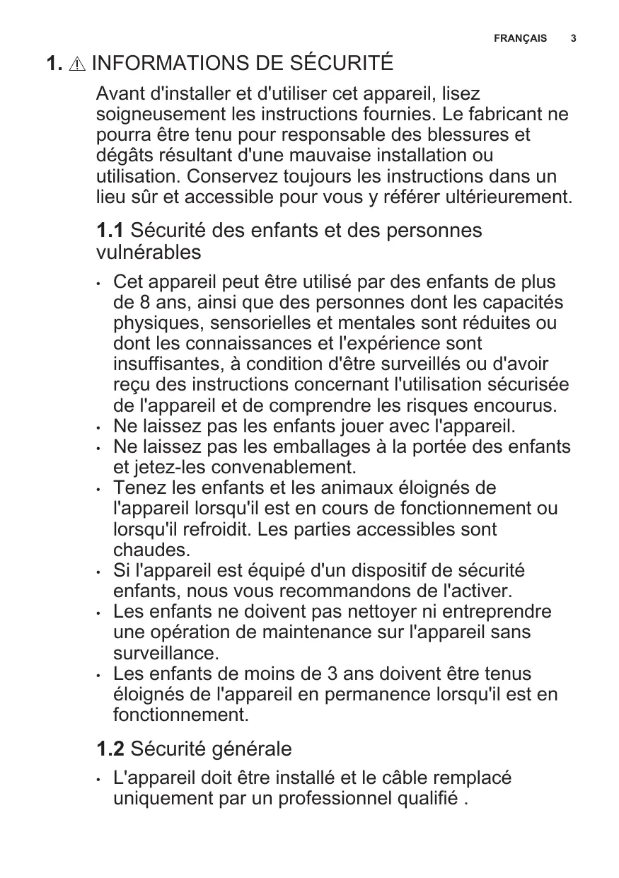Cet appareil peut être utilisé par des enfants de plus de 8 ans, ainsi que des personnes dont les capacités physiques, sensorielles et mentales sont réduites ou dont les connaissances et l'expérience sont insuffisantes, à condition d'être surveillés ou d'avoir reçu des instructions concernant l'utilisation sécurisée de l'appareil et de comprendre les risques encourus. Ne laissez pas les enfants jouer avec l'appareil. Ne laissez pas les emballages à la portée des enfants et jetez-les convenablement. Tenez les enfants et les animaux éloignés de l'appareil lorsqu'il est en cours de fonctionnement ou lorsqu'il refroidit. Les parties accessibles sont chaudes. Si l'appareil est équipé d'un dispositif de sécurité enfants, nous vous recommandons de l'activer. Les enfants ne doivent pas nettoyer ni entreprendre une opération de maintenance sur l'appareil sans surveillance. Les enfants de moins de 3 ans doivent être tenus éloignés de l'appareil en permanence lorsqu'il est en fonctionnement.