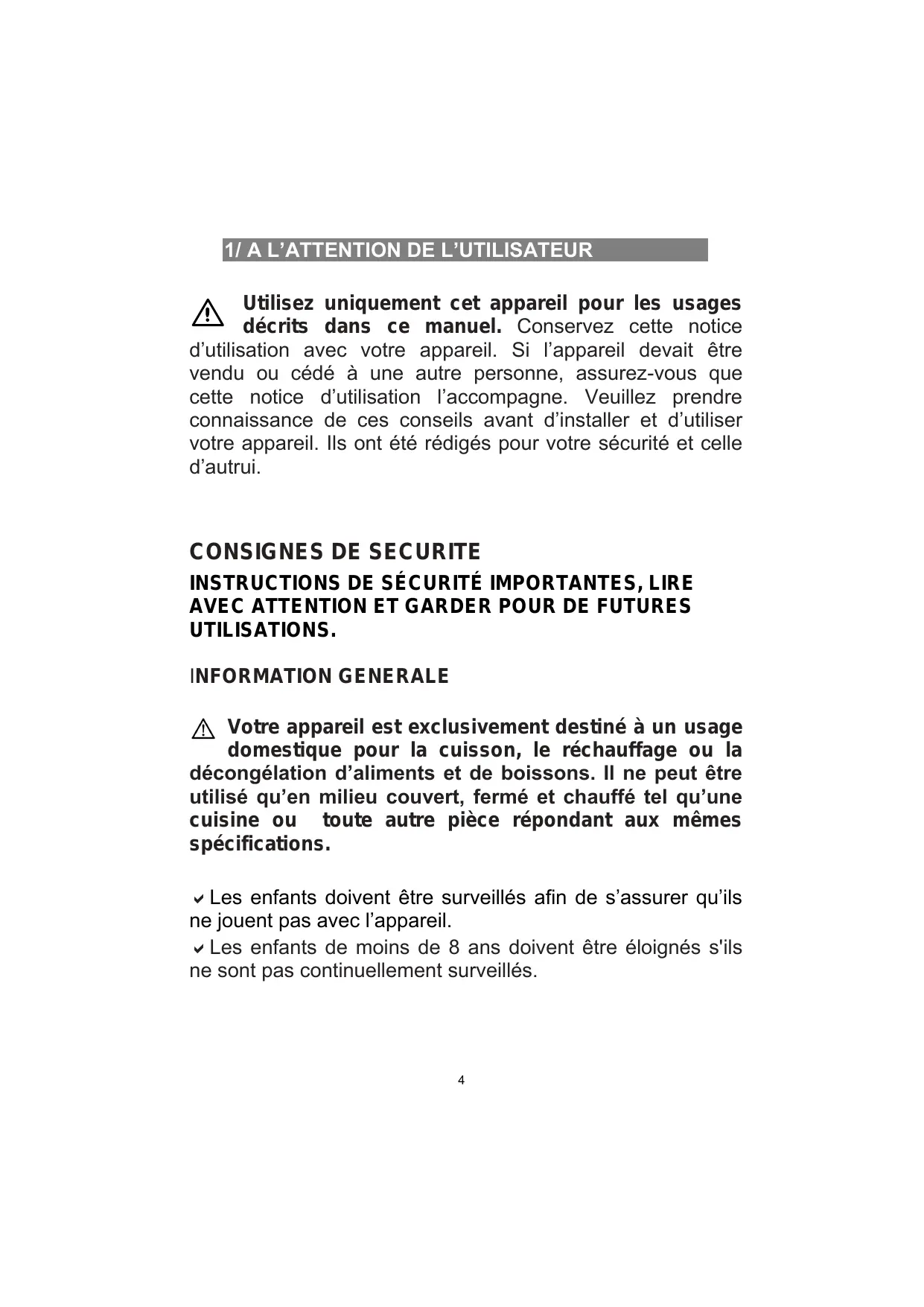 AVEC ATTENTION ET GARDER POUR DE FUTURES UTILISATIONS. INFORMATION GENERALE Votre appareil est exclusivement destiné à un usage domestique pour la cuisson, le réchauffage ou la décongélation d’aliments et de boissons. Il ne peut être utilisé qu’en milieu couvert, fermé et chauffé tel qu’une cuisine ou toute autre pièce répondant aux mêmes spécifications. Les enfants doivent être surveillés afin de s’assurer qu’ils ne jouent pas avec l’appareil. Les enfants de moins de 8 ans doivent être éloignés s'ils ne sont pas continuellement surveillés.