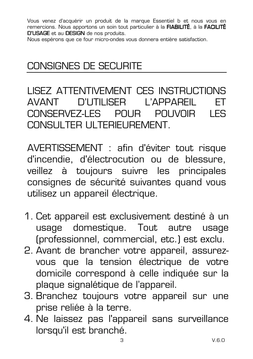 Vous venez d’acquérir un produit de la marque Essentiel b et nous vous en remercions. Nous apportons un soin tout particulier à la FIABILITÉ, FIABILITÉ à la FACILITÉ D'USAGE et au DESIGN de nos produits. Nous espérons que ce four micro-ondes vous donnera entière satisfaction.
