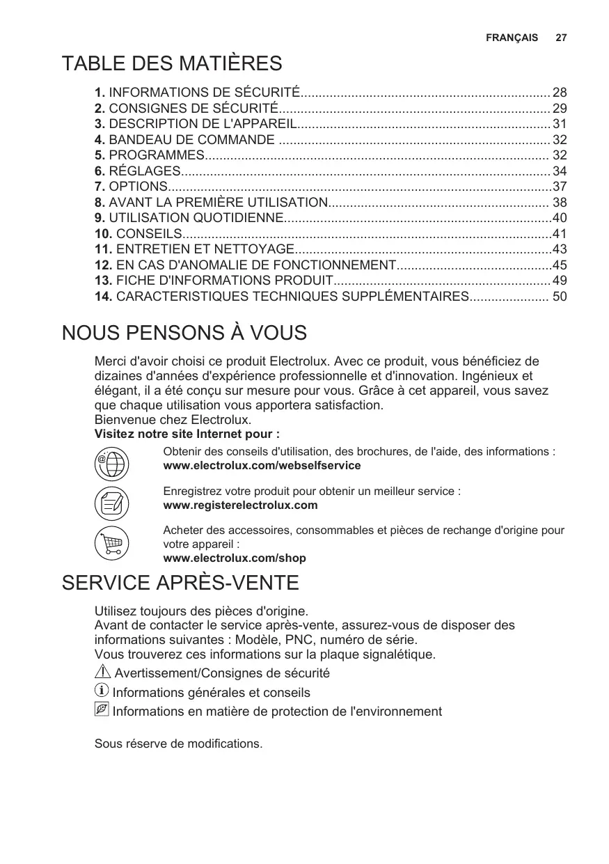 Merci d'avoir choisi ce produit Electrolux. Avec ce produit, vous bénéficiez de dizaines d'années d'expérience professionnelle et d'innovation. Ingénieux et élégant, il a été conçu sur mesure pour vous. Grâce à cet appareil, vous savez que chaque utilisation vous apportera satisfaction. Bienvenue chez Electrolux. Visitez notre site Internet pour : Obtenir des conseils d'utilisation, des brochures, de l'aide, des informations : www.electrolux.com/webselfservice Enregistrez votre produit pour obtenir un meilleur service : www.registerelectrolux.com Acheter des accessoires, consommables et pièces de rechange d'origine pour votre appareil : www.electrolux.com/shop
