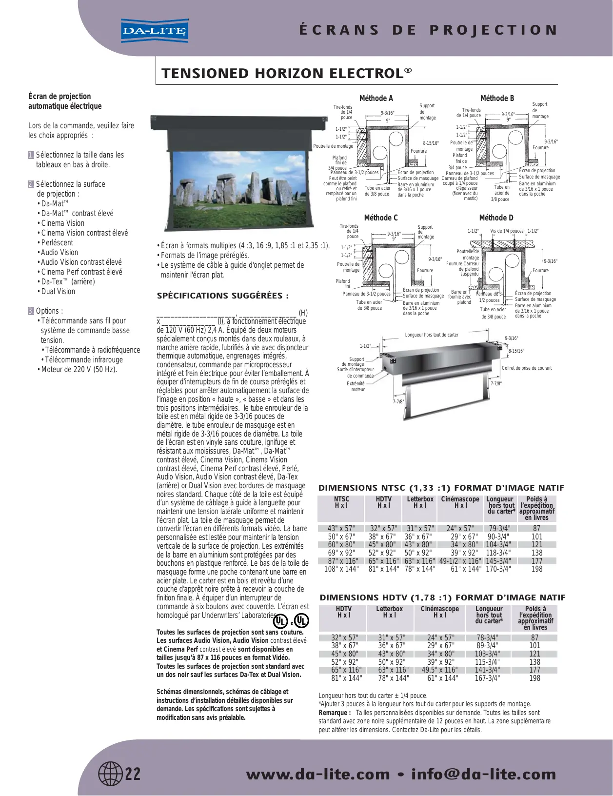 TENSIONED HORIZON ELECTROL - Écran de projection DA-LITE - Notice d'utilisation et mode d'emploi gratuit