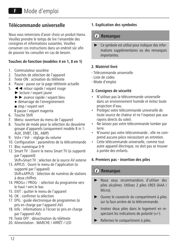 ► Ce symbole est utilisé pour indiquer des informations supplémentaires ou des remarques importantes. 2. Matériel livré - Télécommande universelle - Liste de codes - Mode d‘emploi 3. Consignes de sécurité • N‘utilisez pas la télécommande universelle dans un environnement humide et évitez toute projection d‘eau. • Protégez votre télécommande universelle de toute source de chaleur et ne l‘exposez pas aux rayons directs du soleil. • Ne laissez pas votre télécommande tomber par terre. • N‘ouvrez pas votre télécommande ; elle ne comprend aucune pièce nécessitant un entretien. • Cette télécommande universelle, comme tout autre appareil électrique, ne doit pas se trouver à portée des enfants. 4. Premiers pas - insertion des piles