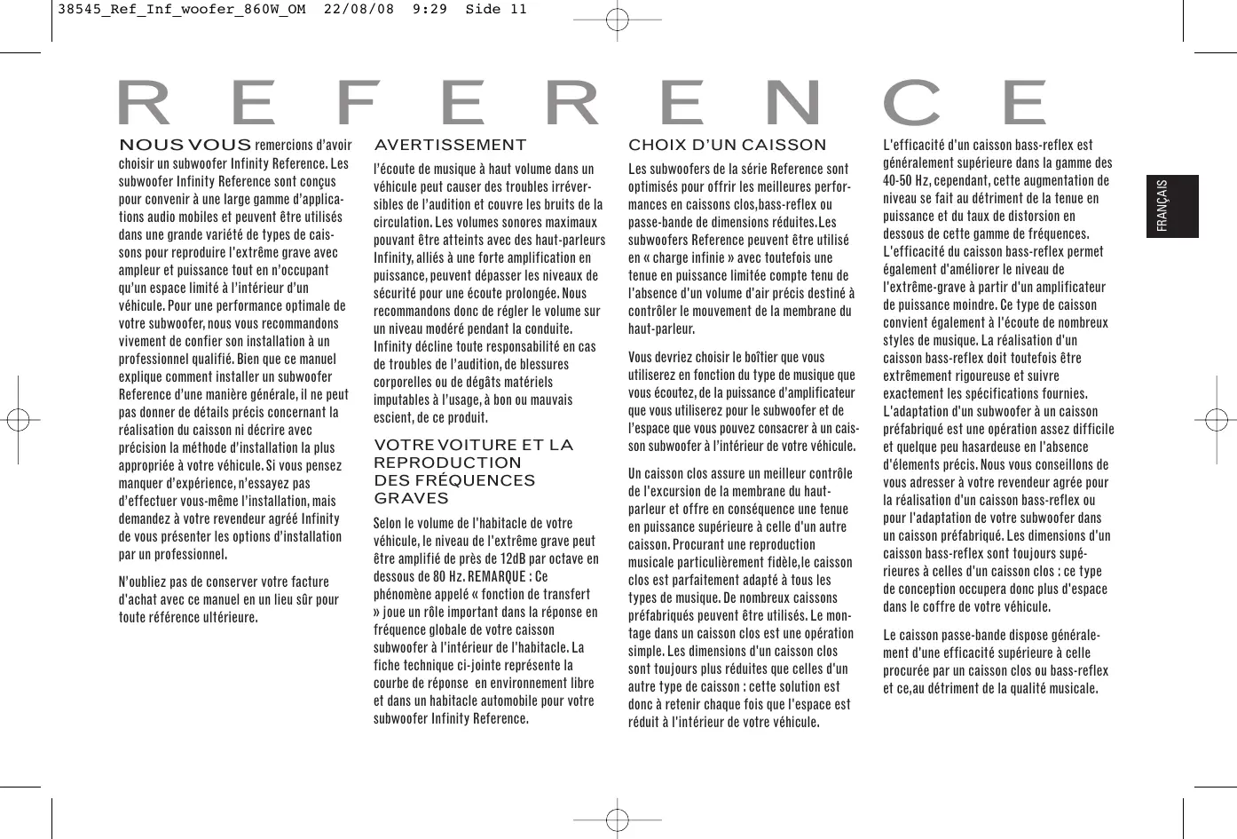 NOUS VOUS remercions d'avoir désirir un subwoofer Infinity Reference. Les subwoofer Infinity Reference sont concus pour convenir à une large gamme d'appli-cations audio mobiles et peuvent être utilisés dans une grande variété de types de caissons pour reproductive l'extrème grave avec ampleur et puissance tout en n'occupant qu'un espace limite à l'intérieur d'un vehicule. Pour une performance optimale de votre subwoofer, nous vous recommendons vivement de confier son installation à un professionnel qualifié. Bien que ce manuel explique comment installer un subwoofer Reference d'une manière générale, il ne peut pas donner de détails précis concernant la réalisation du caisson ni décrire avec précision la méthode d'installation la plus appropriée à votre vehicule. Si vous pensez manquer d'expérience, n'essayez pas d'effectuer vous-même l'installation, mais demandez à votre revendeur agrée Infinity de vousprésenter les options d'installation par un professionnel.