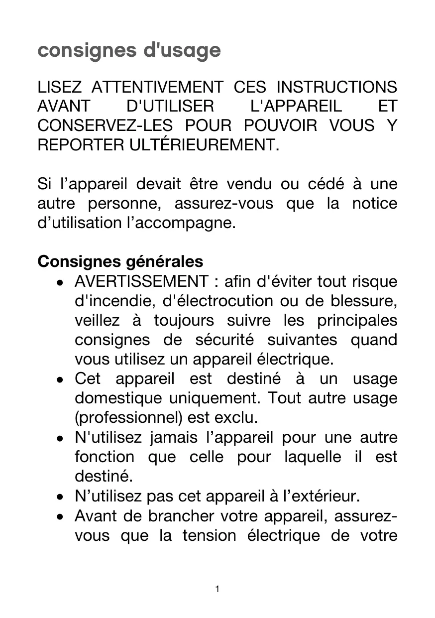 - Cet apparéil est destiné à un usage domestique uniquement. Tout autre usage (professionnel) est exclu.
