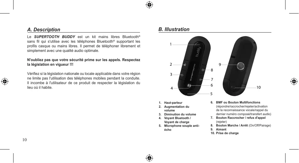 Le SUPERTOOTH BUDDY est un kit mains libres Bluetooth® sans fil qui s'utilise avec les téléphones Bluetooth® supportant les profils casque ou mains libres. Il permet de téléphoner librement et simplement avec une qualité audio optimale. N'oubliez pas que votre sécurité prime sur les appels. Respectez la législation en vigueur !!! Vérifiez si la législation nationale ou locale applicable dans votre région ne limite pas l'utilisation des téléphones mobiles pendant la conduite. Il incombe à l'utilisateur de ce produit de respecter la législation du lieu où il habite.