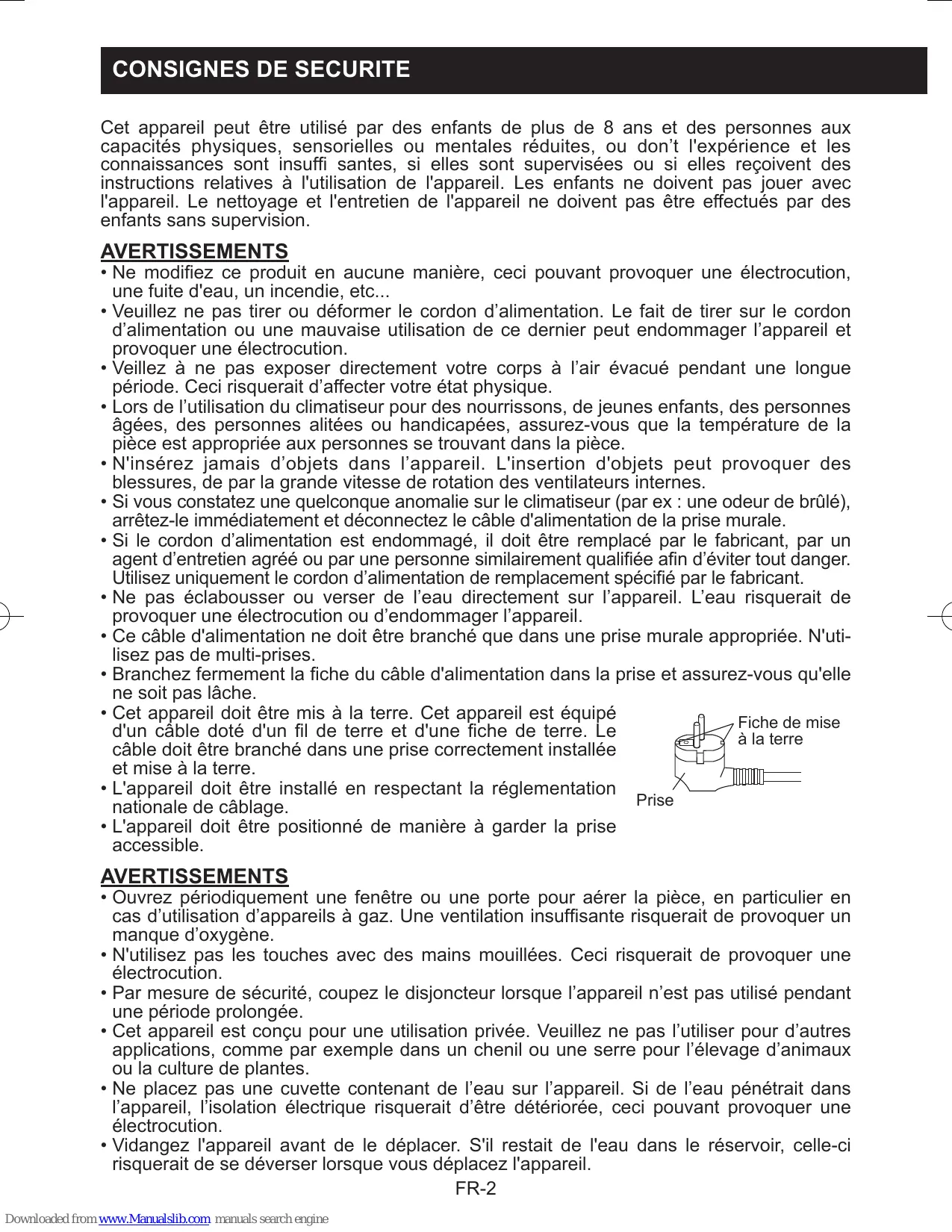 • N'utilisez pas les touches avec des mains mouillées. Ceci risquerait de provoquer une électrocution. • Par mesure de sécurité, coupez le disjoncteur lorsque l’appareil n’est pas utilisé pendant une période prolongée. • Cet appareil est conçu pour une utilisation privée. Veuillez ne pas l’utiliser pour d’autres applications, comme par exemple dans un chenil ou une serre pour l’élevage d’animaux ou la culture de plantes. • Ne placez pas une cuvette contenant de l’eau sur l’appareil. Si de l’eau pénétrait dans l’appareil, l’isolation électrique risquerait d’être détériorée, ceci pouvant provoquer une électrocution. • Vidangez l'appareil avant de le déplacer. S'il restait de l'eau dans le réservoir, celle-ci risquerait de se déverser lorsque vous déplacez l'appareil. FR-2 Downloaded from www.Manualslib.com manuals search engine