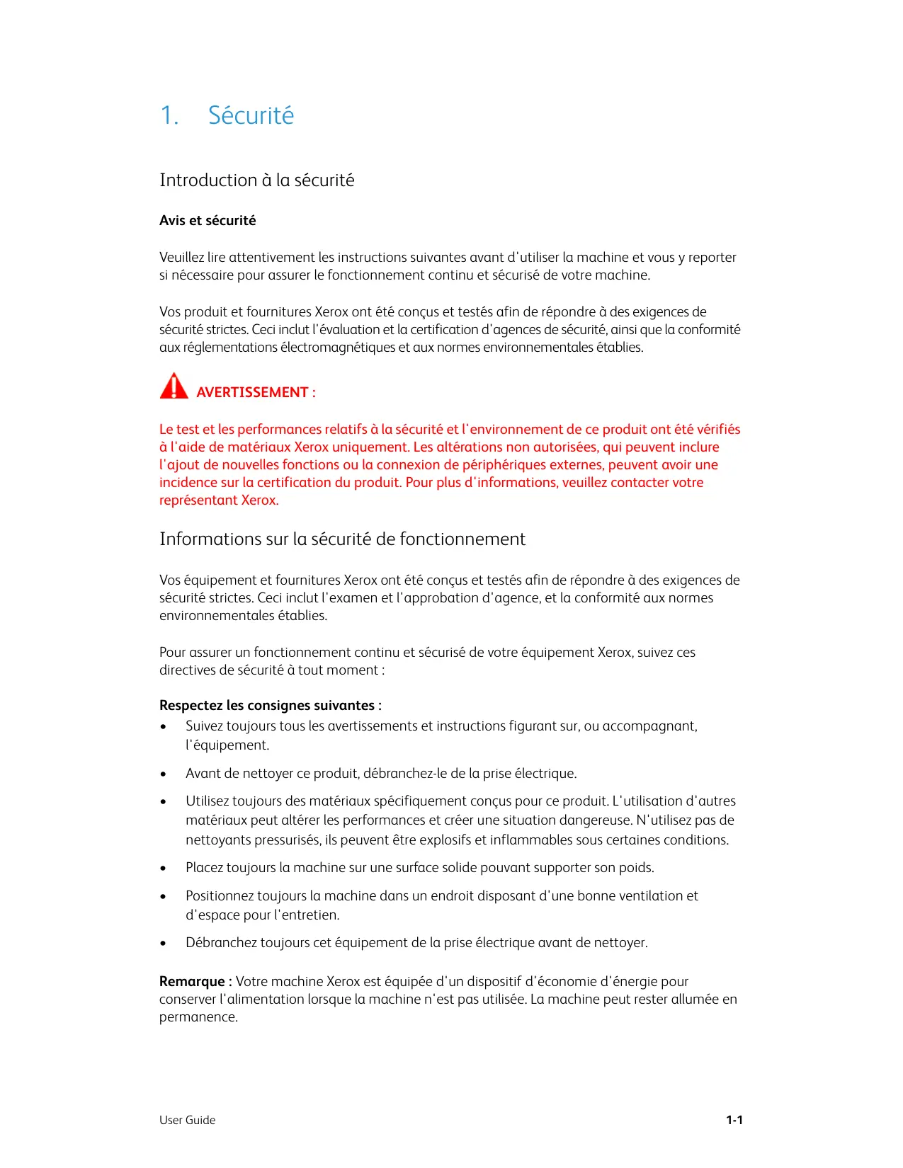 Introduction à la sécurité Avis et sécurité Veuillez lire attentivement les instructions suivantes avant d'utiliser la machine et vous y reporter si nécessaire pour assurer le fonctionnement continu et sécurisé de votre machine. Vos produit et fournitures Xerox ont été conçus et testés afin de répondre à des exigences de sécurité strictes. Ceci inclut l'évaluation et la certification d'agences de sécurité, ainsi que la conformité aux réglementations électromagnétiques et aux normes environnementales établies. AVERTISSEMENT : Le test et les performances relatifs à la sécurité et l'environnement de ce produit ont été vérifiés à l'aide de matériaux Xerox uniquement. Les altérations non autorisées, qui peuvent inclure l'ajout de nouvelles fonctions ou la connexion de périphériques externes, peuvent avoir une incidence sur la certification du produit. Pour plus d'informations, veuillez contacter votre représentant Xerox.