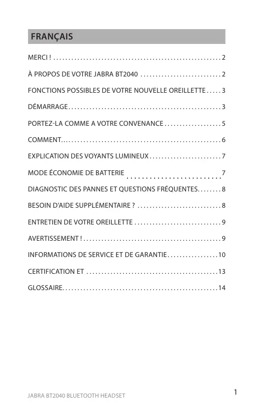 - Bluetooth version 2.0 (voir glossaire) Français Fonctions possibles de votre nouvelle oreillette Démarrage La Jabra BT2040 est facile à utiliser. Avant d’utiliser votre oreillette, effectuez les trois étapes suivantes :