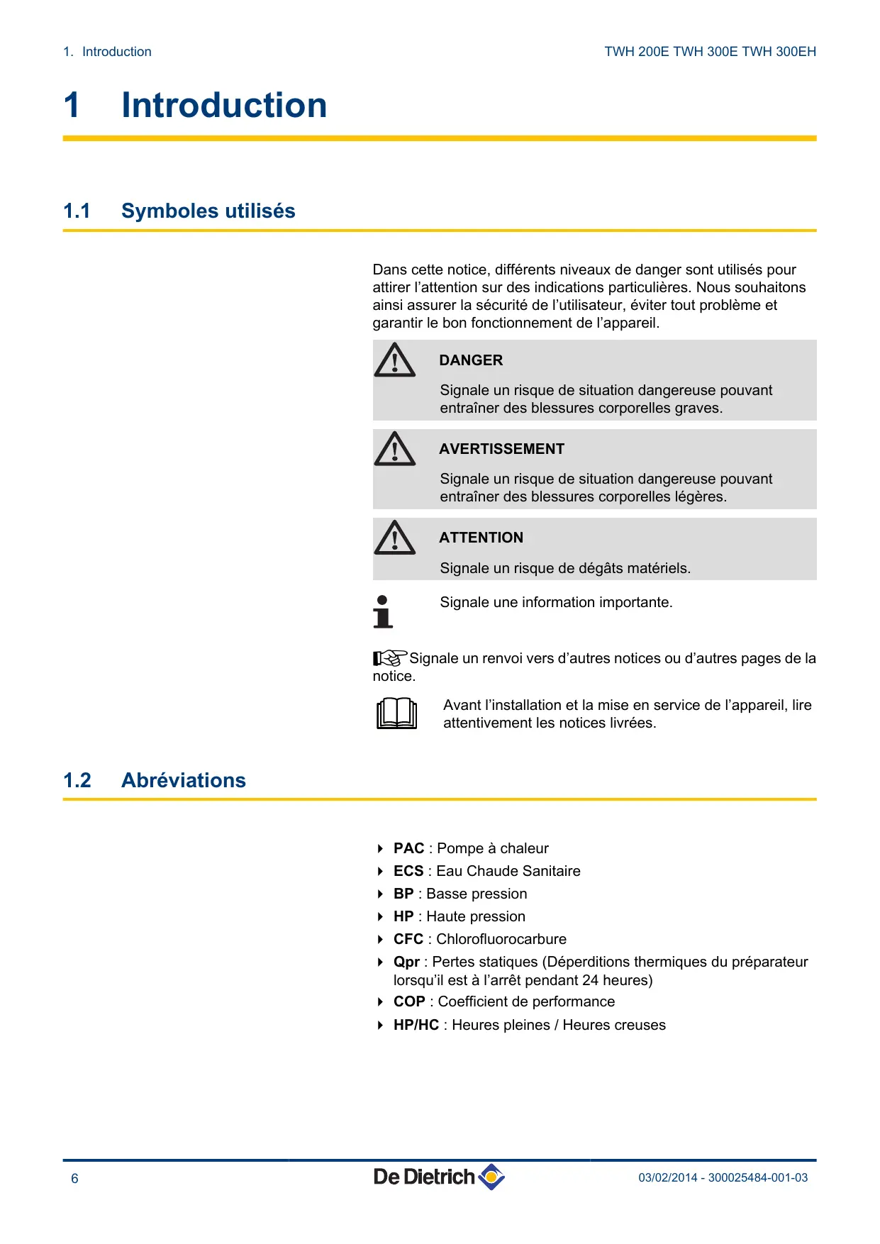 Symboles utilisés Dans cette notice, différents niveaux de danger sont utilisés pour attirer l’attention sur des indications particulières. Nous souhaitons ainsi assurer la sécurité de l’utilisateur, éviter tout problème et garantir le bon fonctionnement de l’appareil. DANGER Signale un risque de situation dangereuse pouvant entraîner des blessures corporelles graves. AVERTISSEMENT Signale un risque de situation dangereuse pouvant entraîner des blessures corporelles légères. ATTENTION Signale un risque de dégâts matériels. Signale une information importante. ¼Signale un renvoi vers d’autres notices ou d’autres pages de la notice. Avant l’installation et la mise en service de l’appareil, lire attentivement les notices livrées.