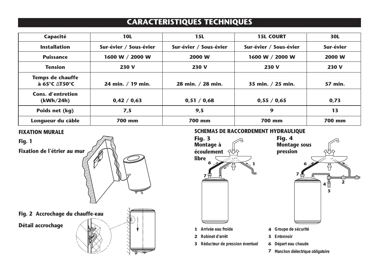 Emplacement : Le chauffe-eau doit être installé le plus près possible du lieu d’utilisation, dans un local à l’abri du gel. Fixation murale : Fixer l’étrier sur le mur à l’aide de goujons M8, préalablement scellés et de boulons M8; Prendre le chauffe-eau, le laisser glisser le long du mur afin d’enclencher la patte de l’étrier dans le logement situé à l’arrière du manteau (Fig.1). Raccordement hydraulique : L’installation d’un robinet d’arrêt sur l’alimentation d’eau est obligatoire. D’autre part, il est indispensable d’utiliser un réducteur de pression lorsque la pression d’alimentation est supérieur à 5,5 bars. NOTA : Le raccordement du chauffe-eau à une canalisation en cuivre doit obligatoirement être effectué avec interposition de manchons réduits ou égaux mâle-femelle en fonte. Montage à écoulement libre : Alimentation d’un seul point d’eau (Fig. 3). L’installation est généralement réalisée avec un robinet mélangeur à écoulement libre (non fourni). Un groupe de sécurité n’est pas nécessaire. Remarque : Lors d’un montage à écoulement libre, la sortie d’eau chaude ne doit jamais être obturée ou freinée. Lors de la chauffe une petite quantité d’eau peut s’écouler par la robinetterie. Montage sous pression : Alimentation de plusieurs point d’eau (Fig. 4). L’installation doit être effectuée avec un groupe de sécurité neuf, aux dimensions appropriées (15 x 21) portant la marque de qualité NF. Le fonctionnement correct de l’appareil n’est garanti que s’il est équipé de cet accessoire. L’écoulement résultant de surpression ne doit en aucun cas être freinée. Ceci implique que le tube d’écoulement ait une pente continue et suffisante et que sa section ne soit en aucun point inférieure à l’orifice de sortie du groupe. Il est recommandé de monter un entonnoir-siphon sur la tuyauterie d’écoulement afin de vérifier facilement le bon fonctionnement de la soupape de sécurité. Remarque : Lors de la chauffe, l’eau contenue dans la cuve, se dilate. Une partie de cette eau s’échappe par l’écoulement (jusqu’à 2 à 3% de la capacité maximale du chauffe-eau). Ce phénomène est totalement normal. Branchement électrique : Le chauffe-eau est muni d’un câble d’alimentation 3 conducteurs. Ce câble doit être raccordé à l’interrupteur omnipolaire (distance de contact de 3 mm) soit directement, soit à un câble venant de cet interrupteur par l’intermédiaire d’une boite de dérivation. Il est interdit de raccorder l’appareil par une prise de courant murale. La mise à la terre de l’appareil est obligatoire (fil vert-jaune sur le câble de raccordement).