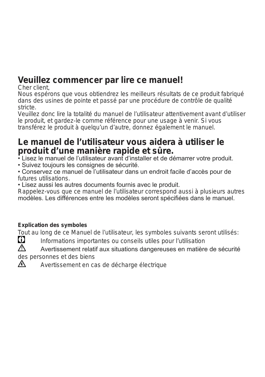 - Lisez le manuel de l’utilisateur avant d’installer et de démarrer votre produit.