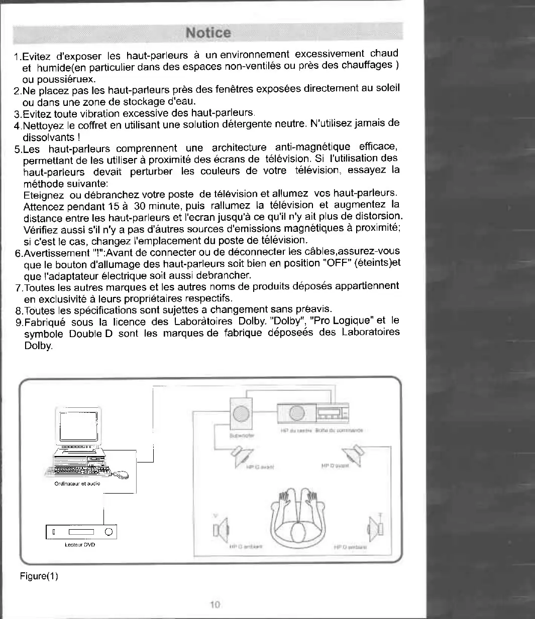 Sortiedu lecteurDVDou carteson Hau!parleur Avant droite Haut-parleur central (arriöre) HauFparleur Avant gauche Caisson de basses (arriöre) 1.Relial"la sourcede sortiede l'appareilau haut-parleur centralavec la boite de I'amplificateur(Votre source de sortib peut dtre un lecteurDVD avecddcodeur.une boitede d6codageou une carte son PC avec une sortie5.1 voies). 2.Reliezla priseDIN g brochesde ia sortiede la boitede contrölede l'amplificateur ä l'entr6edu caissonde basses(DriseDIN g broches). 3.Connectez le canaldu haut-parleur frontalä qauche(FL)/ hautparleurfrontalä droite(FR)et le haut-parleur en inseranile cäble et du panneausubwoofer. . RCA dans le terminaldes haut-parleuis 4.Branchezla prised'alimentation secteurdu pänneaudu caissonde basseset l'adaptateur secteurde la boitedu decodeur. 5.lns6rezI'adaptateur secteur,venantdes haut-parleurs surround, dans la prisede courant. 6.Une fois tous les branchementseffectu6s,mettez le svstöme sous tension. Haut-padeur Arridredroite 't'l Haut-parleur Ar öre gauche Haut-parleurcentral (arriöre) LecteurDVD(arriöre) | 5.'1voies (sortieAC-3) Haut-parleurcentral (arridre)