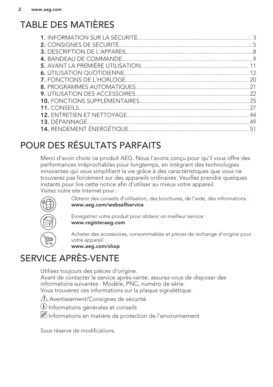 Merci d'avoir choisi ce produit AEG. Nous l'avons conçu pour qu'il vous offre des performances irréprochables pour longtemps, en intégrant des technologies innovantes qui vous simplifient la vie grâce à des caractéristiques que vous ne trouverez pas forcément sur des appareils ordinaires. Veuillez prendre quelques instants pour lire cette notice afin d'utiliser au mieux votre appareil.